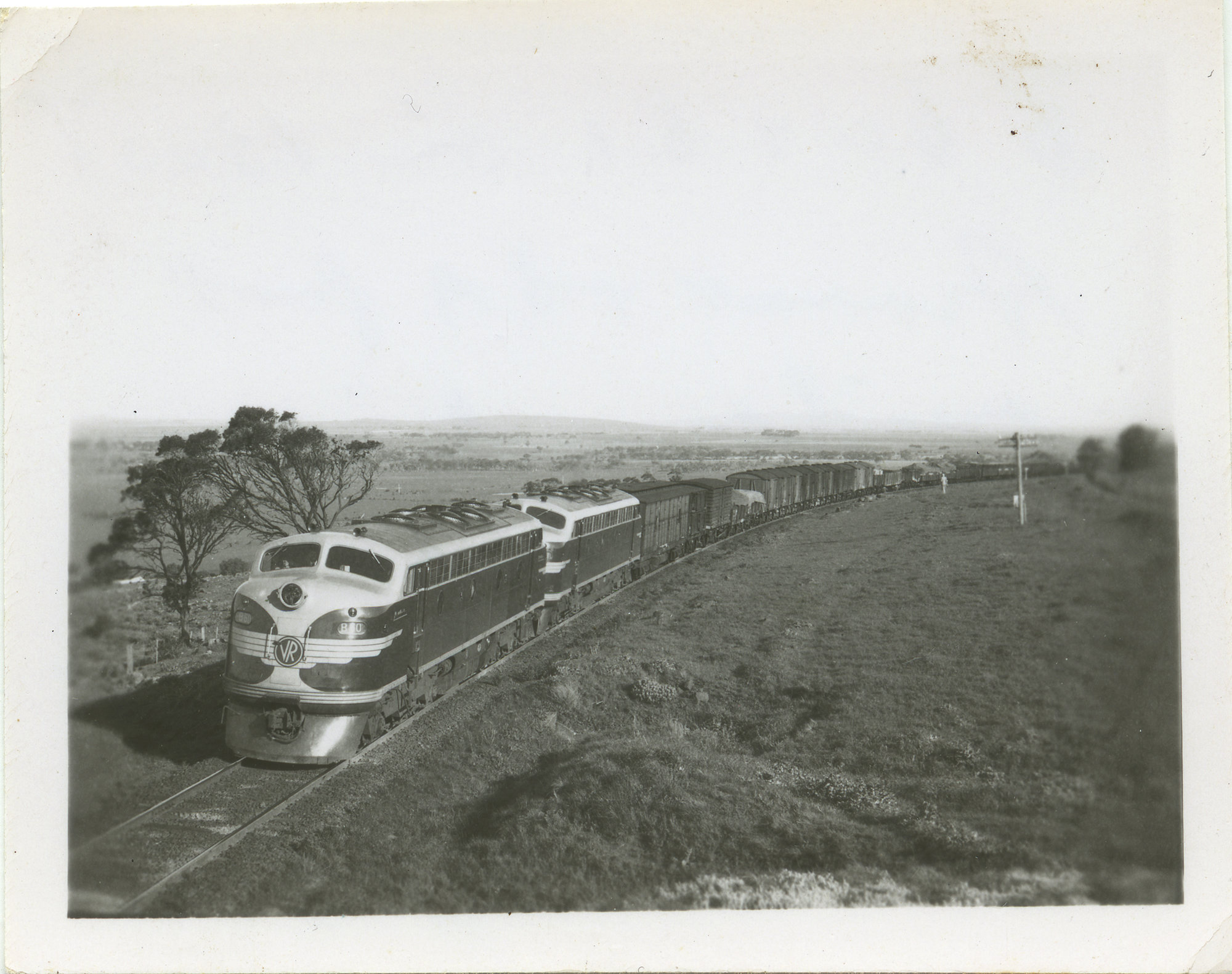 Victorian Railways B class, no. B60 "Harold W. Clapp" and no. B61 "Bernie Baker", at Ingliston Bank, [September 1952], [ARHSBox067_1899a]. Living Histories, accessed 17/04/2026, https://livinghistories.newcastle.edu.au/nodes/view/85674
