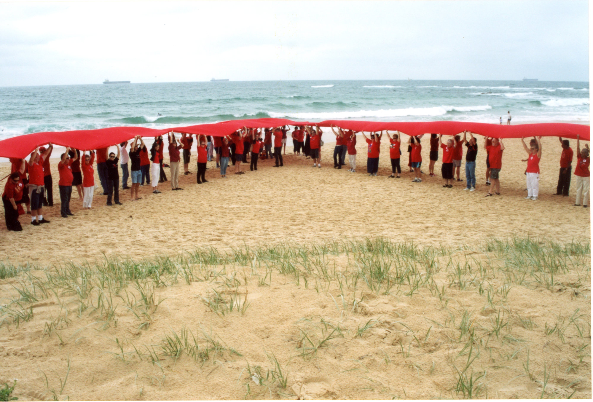 Giant red ribbon for World AIDS Day Newcastle Beach (2001), [C3309_RNHphotos_214]. Living Histories, accessed 29/03/2026, https://livinghistories.newcastle.edu.au/nodes/view/86213