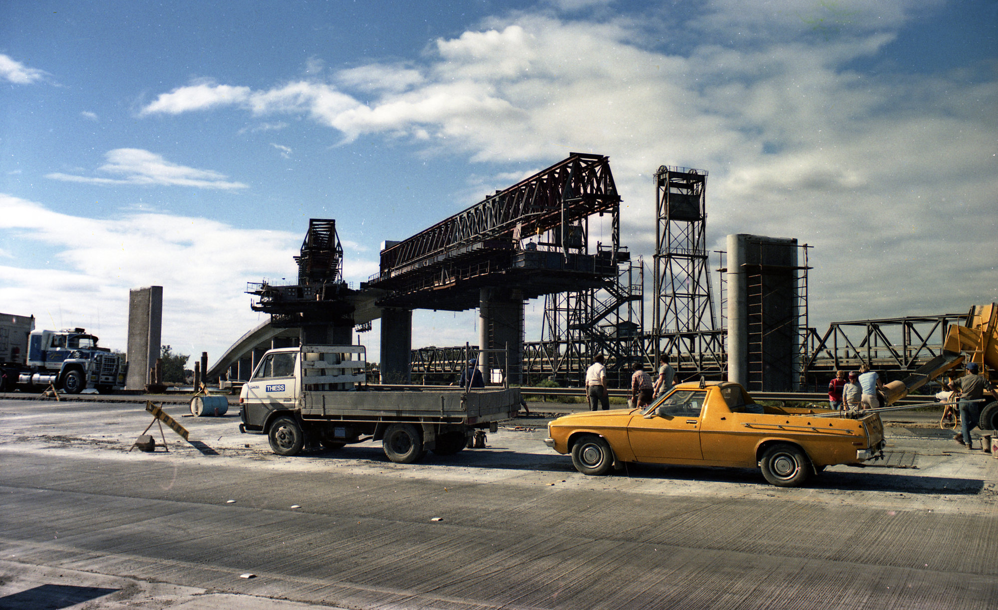 Sternbeck, Percival William, 1921-2004, Hexham Bridge under construction, Hexham, NSW, July 1986 (Between 1st July 1986 and 31st July 1986), [Sternbeck_Bk9_Hexham-Kurri-July-1986-002]. Living Histories, accessed 19/03/2026, https://livinghistories.newcastle.edu.au/nodes/view/86327