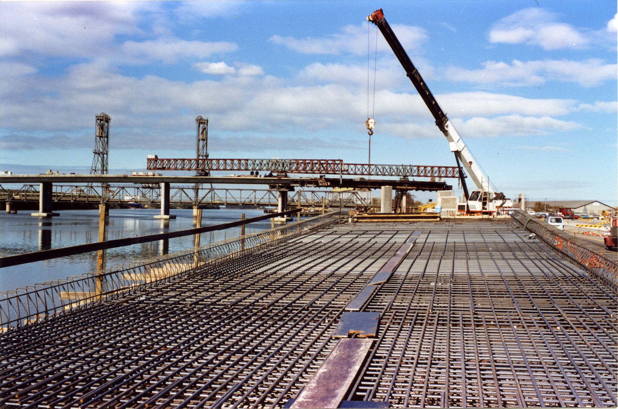 Sternbeck, Percival William, 1921-2004, Hexham Bridge under construction, Hexham, NSW, July 1986 (Between 1st July 1986 and 31st July 1986), [Sternbeck_Bk9_Hexham-Kurri-July-1986-print-010]. Living Histories, accessed 19/03/2026, https://livinghistories.newcastle.edu.au/nodes/view/86343