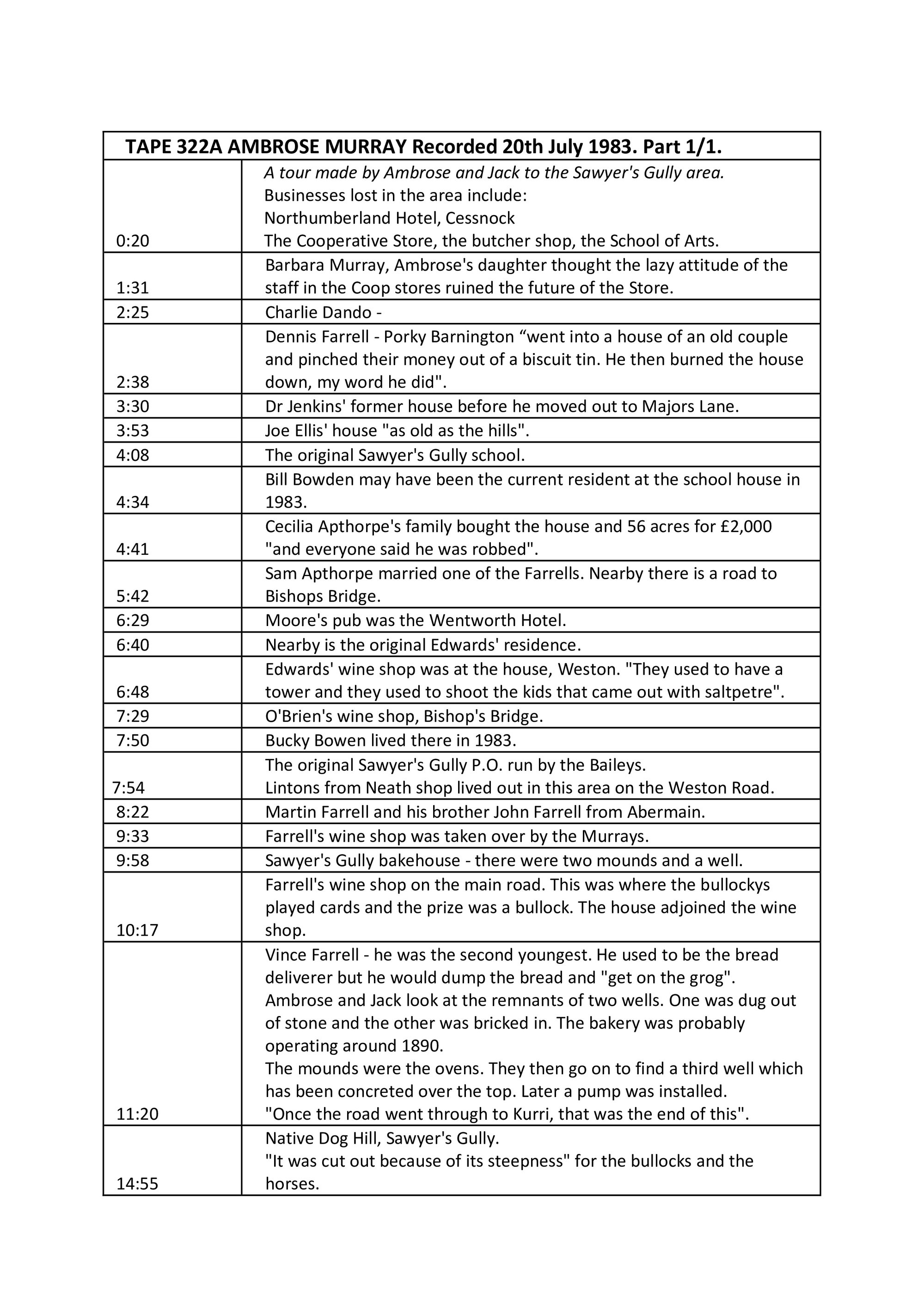Summary : Ambrose Murray (1918-2010) - Mineworker and greyhound trainer. Sawyer's Gully & Bishop's Bridge car tour. Recorded 20 July 1983. Part 1 of 1.