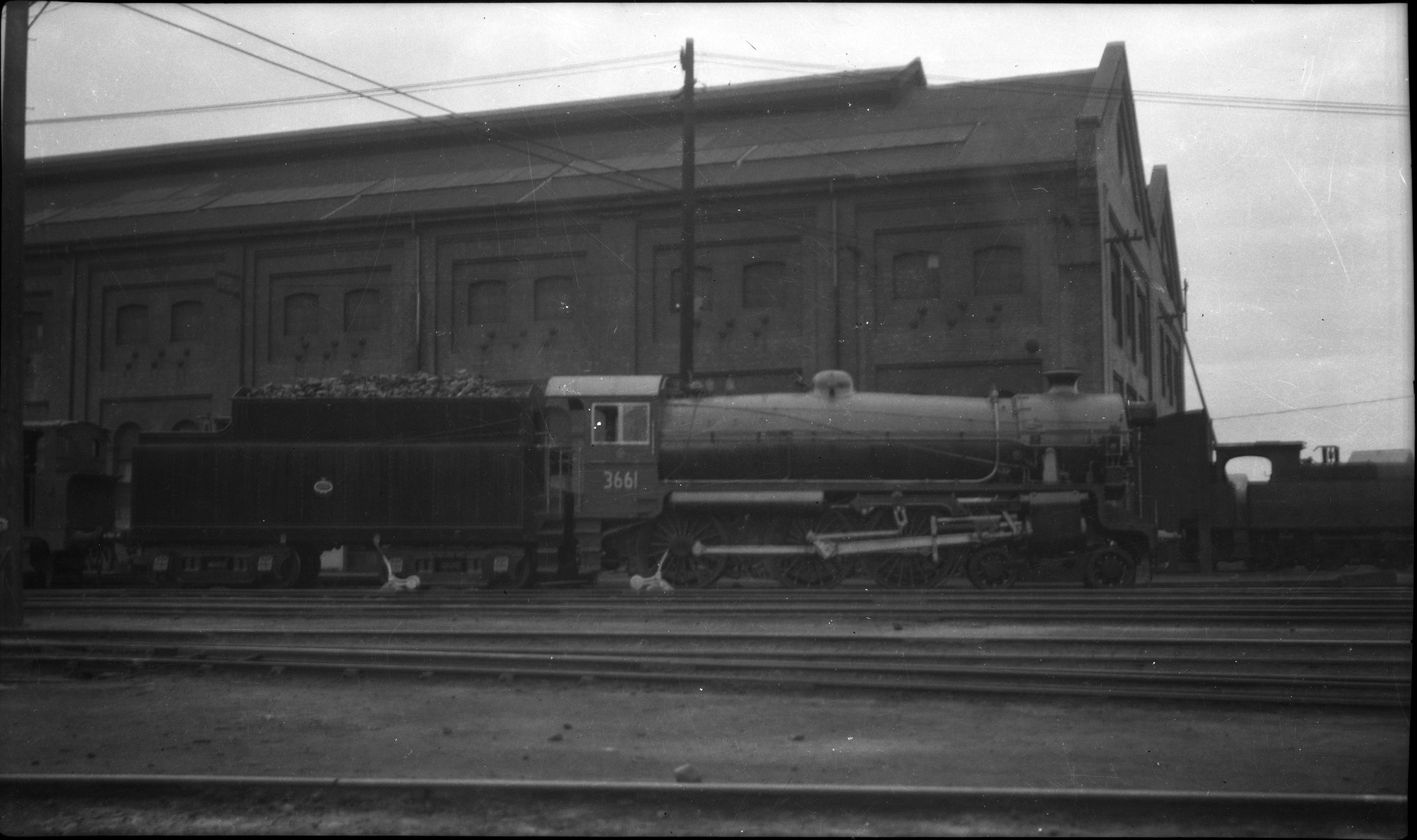 NSWGR C36 Class locomotive, no. 3661, Eveleigh sheds, Sydney, [1934-], [ARHSBox075_2099]. Living Histories, accessed 21/01/2026, https://livinghistories.newcastle.edu.au/nodes/view/86737
