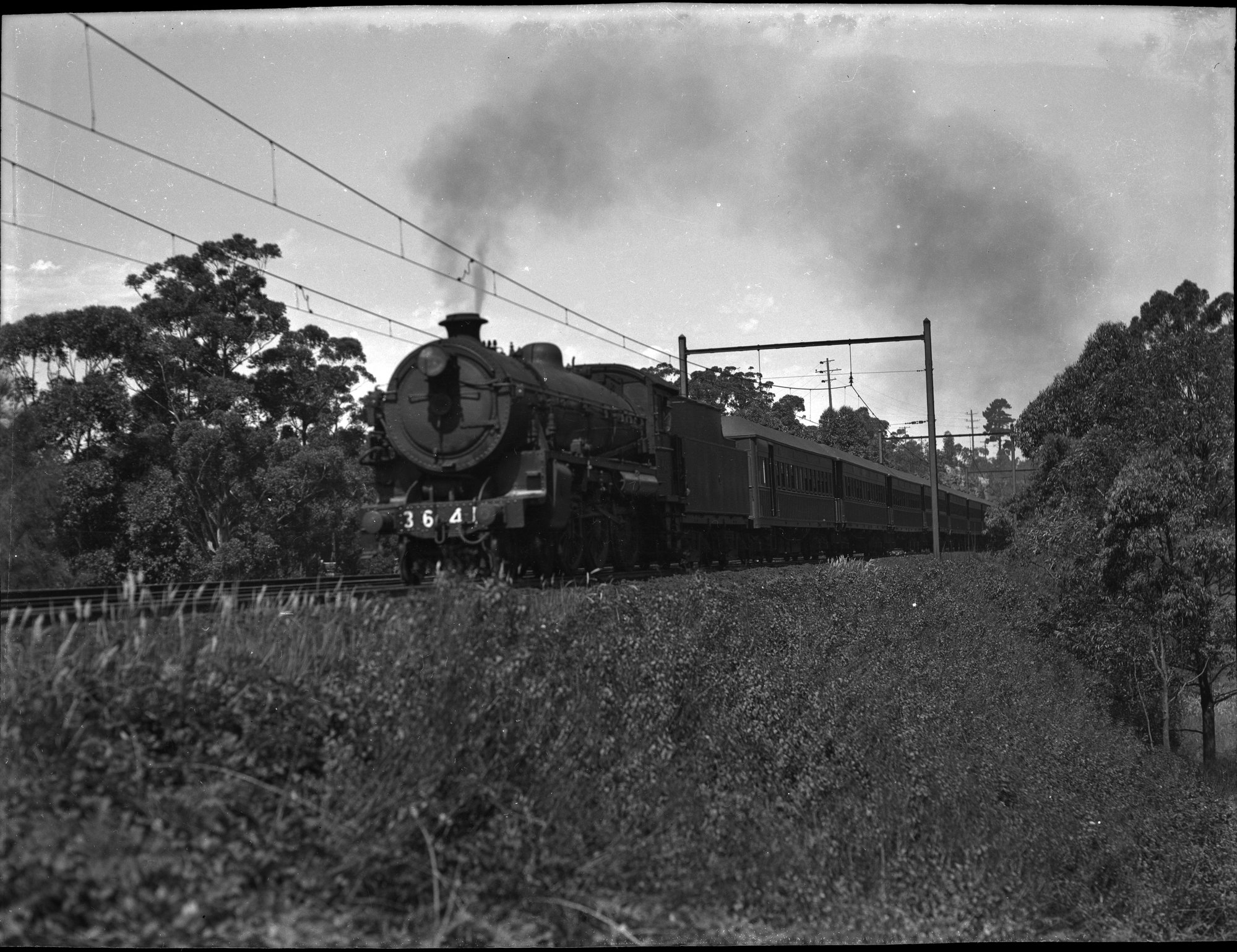 NSWGR C36, no. 3641, hauling pre-WW2 passenger train, unidentified location, [ARHSBox075_2111]. Living Histories, accessed 24/01/2026, https://livinghistories.newcastle.edu.au/nodes/view/86749