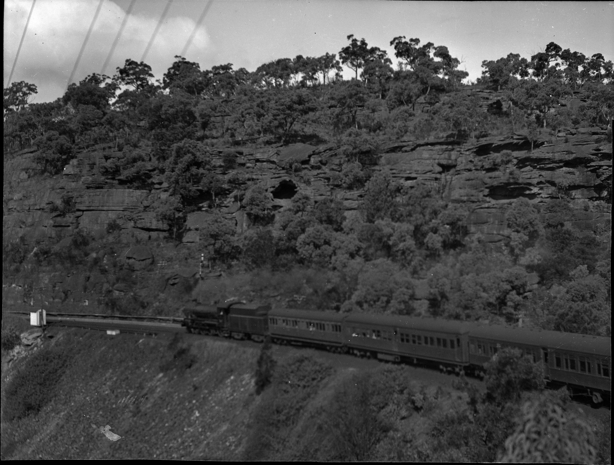 NSWGR C36, no number visible, hauling passenger train downhill through rugged terrain, post-WW2 but before mid-1950's, [ARHSBox075_2118]. Living Histories, accessed 13/02/2026, https://livinghistories.newcastle.edu.au/nodes/view/86756