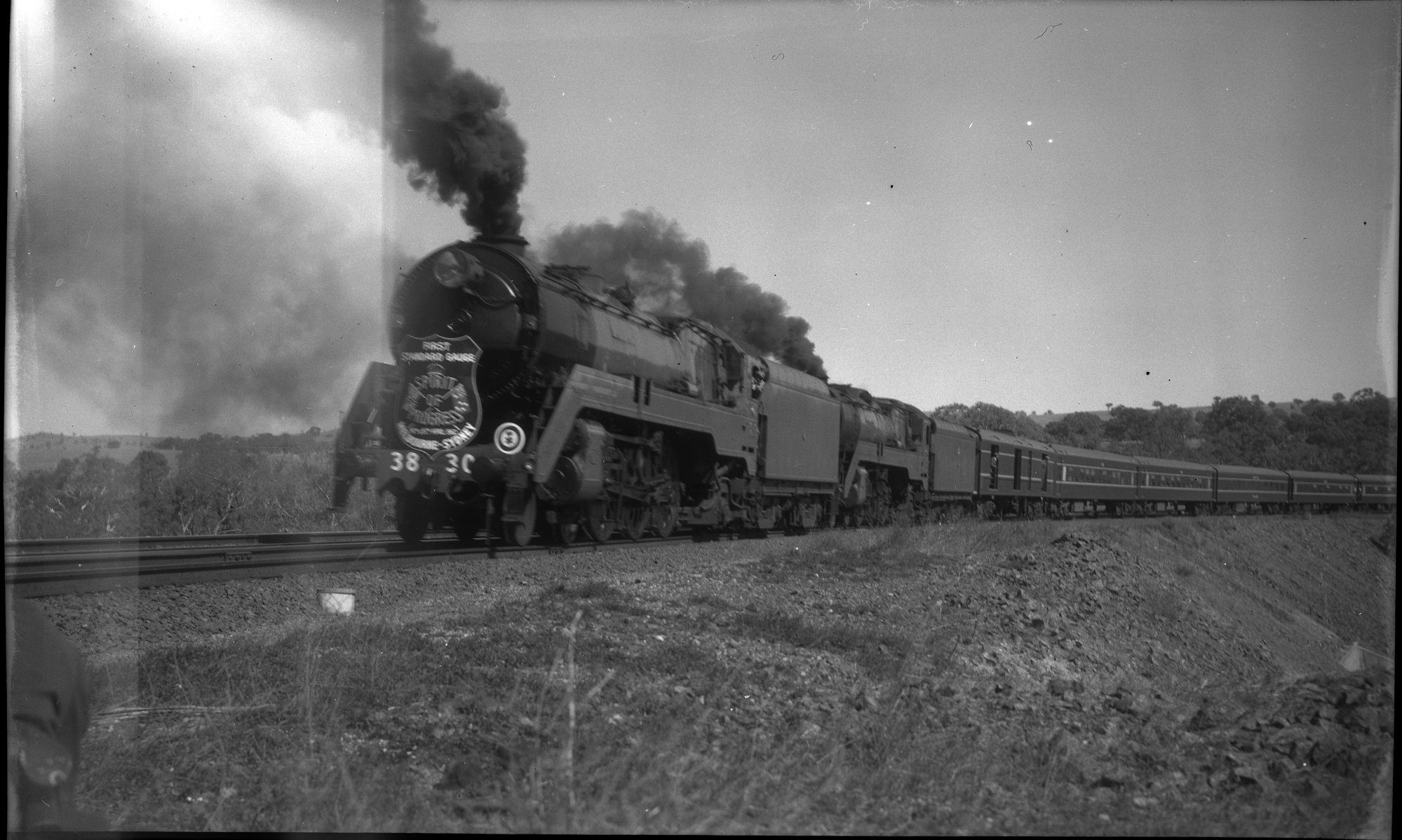 NSWGR C38 Class 3830 and 3813, hauling inaugural standard gauge Spirit of Progress, unidentified location, [15th April 1962]