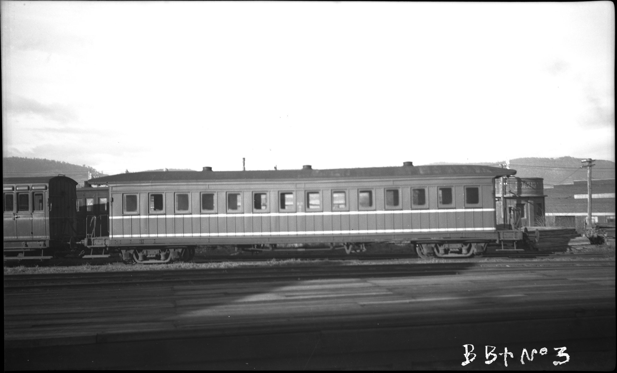 Passenger carriage, caption "BBt No.3", freshly painted but not new, Art Deco brick buildings in background, not NSW, unidentified location, [n.d.]