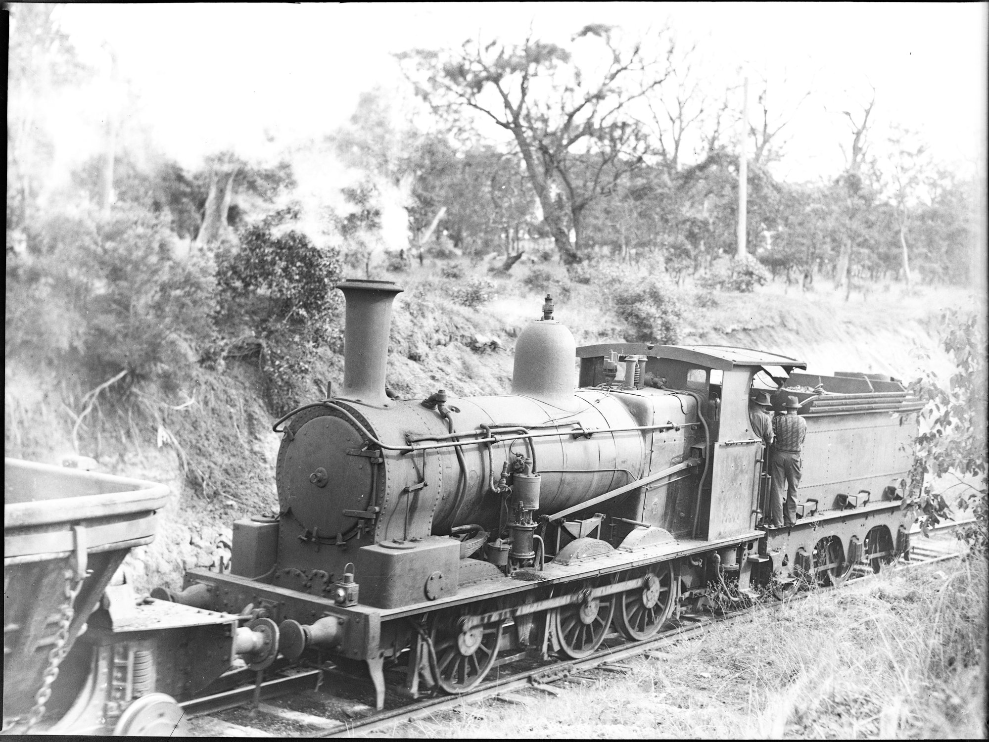 NSWGR Z19 Locomotive, pushing hoppers uphill, unknown location and date., [ARHSBox086_2344]. Living Histories, accessed 18/03/2026, https://livinghistories.newcastle.edu.au/nodes/view/86978