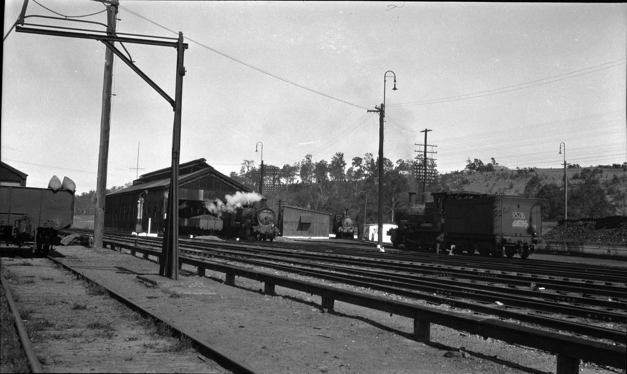 NSWGR locomotives 5523, 1310 and 5526, outside railway shed, Picton, NSW, duplicate of ARHSBox087_2369