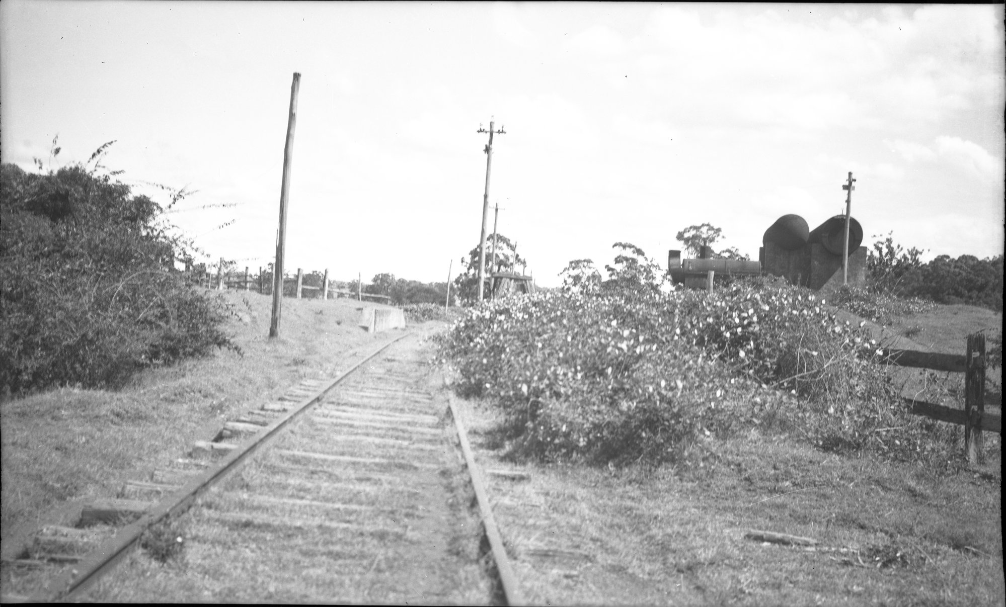 Rural railway line, appears disused, abandoned locomotive boilers in background, unidentified location, [n.d.], [ARHSBox089_2380]. Living Histories, accessed 18/03/2026, https://livinghistories.newcastle.edu.au/nodes/view/87012