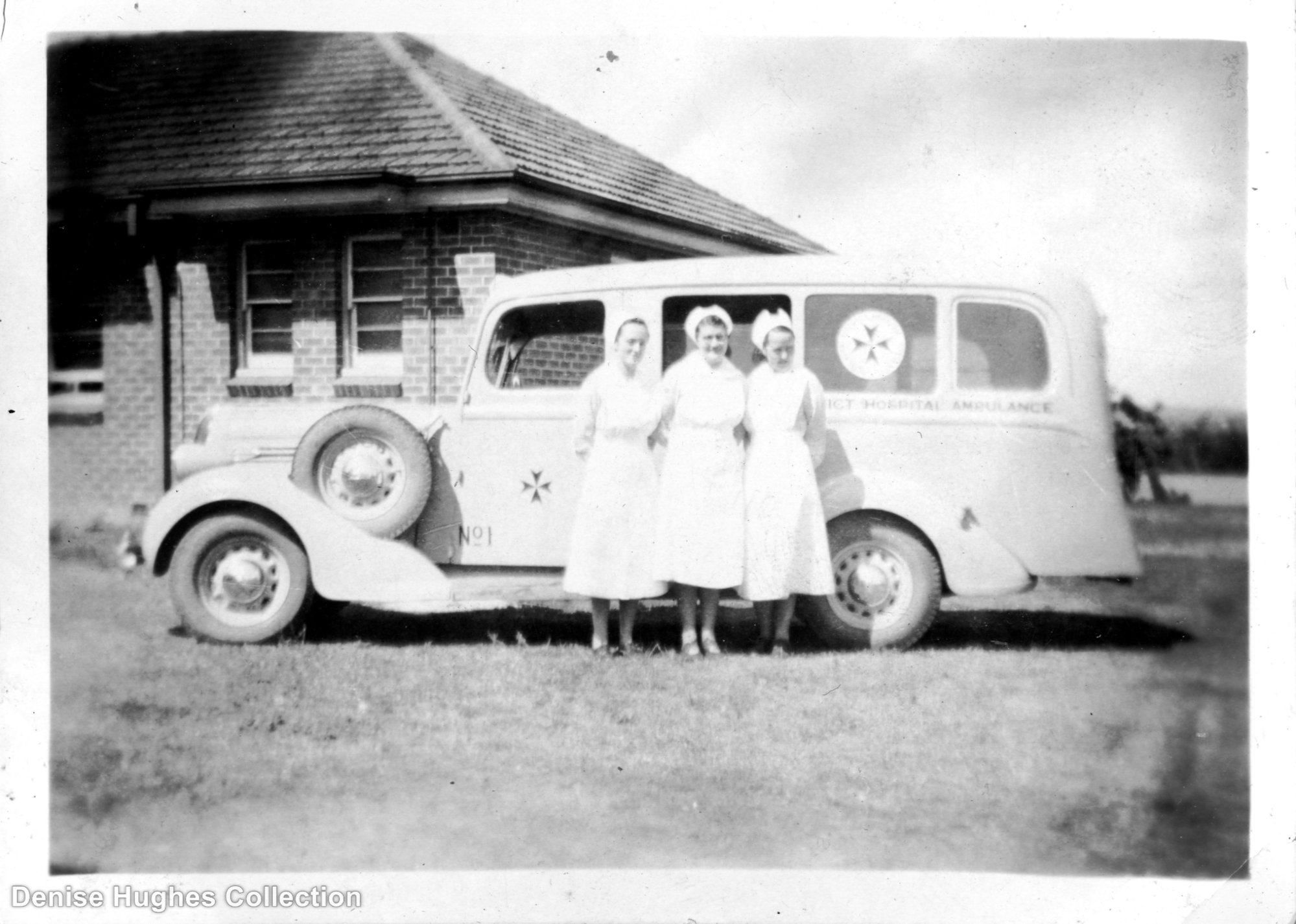 Three nurses with ambulance, Kurri Kurri District Hospital, NSW, [1941] (1941), [Kurri_Hospital_005]. Living Histories, accessed 15/04/2026, https://livinghistories.newcastle.edu.au/nodes/view/87494