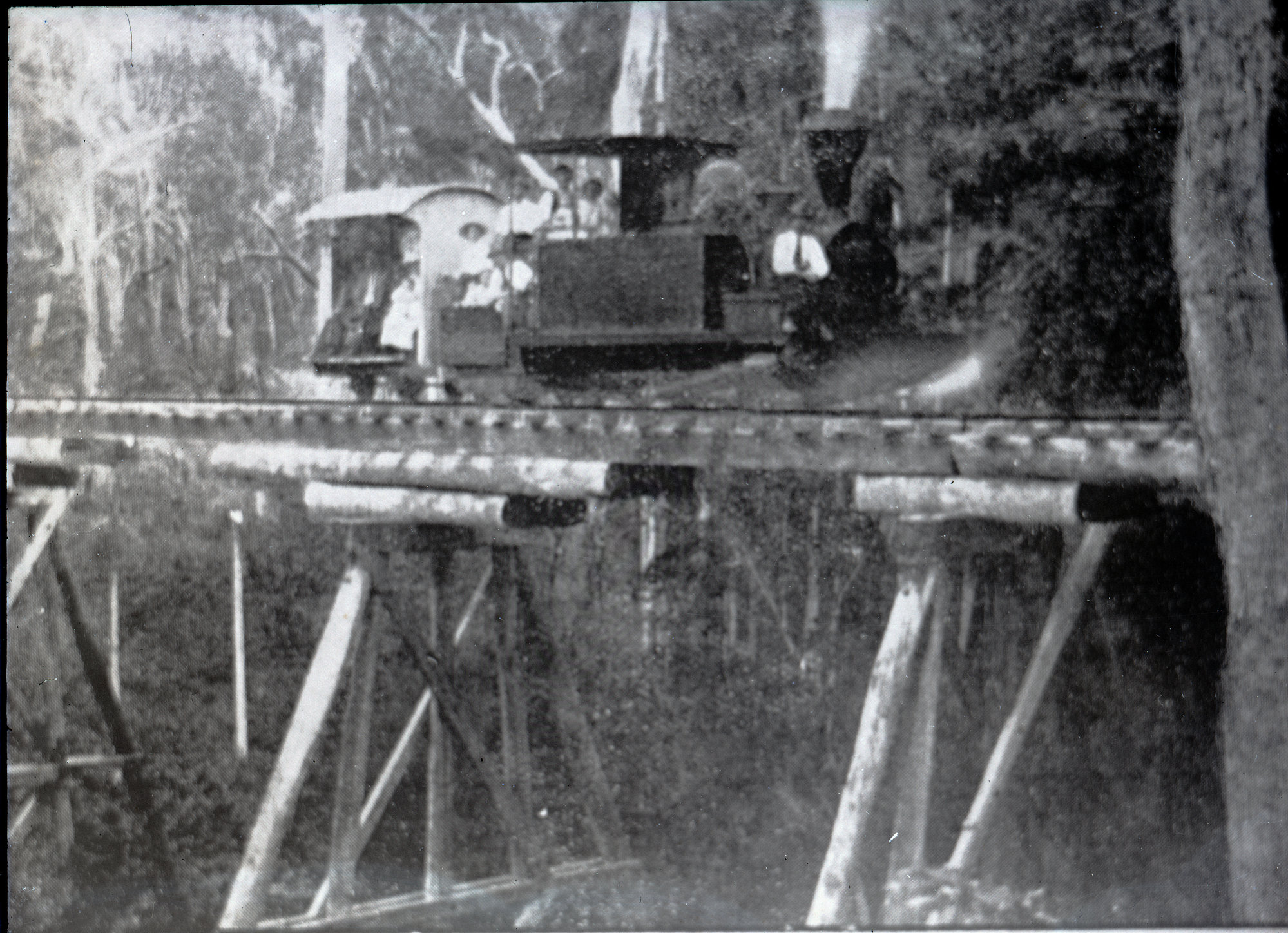 Narrow gauge tank locomotive, probably 0-6-0T, crossing timber trestle bridge with group of sightseers, unidentified location, [n.d.], [ARHSBox103_2602]. Living Histories, accessed 17/04/2026, https://livinghistories.newcastle.edu.au/nodes/view/87710