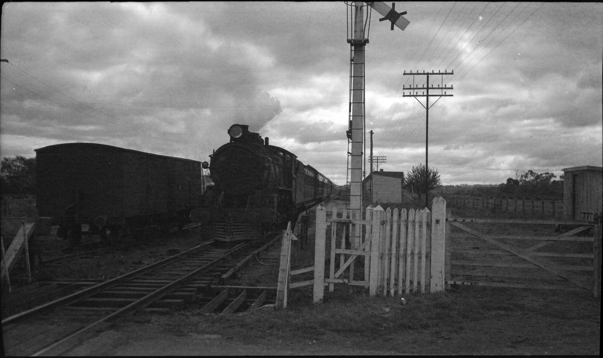 TGR R Class, [no. 4], hauling passengers, at unidentified level crossing, [n.d.], [ARHSBox112_2772]. Living Histories, accessed 15/04/2026, https://livinghistories.newcastle.edu.au/nodes/view/87884