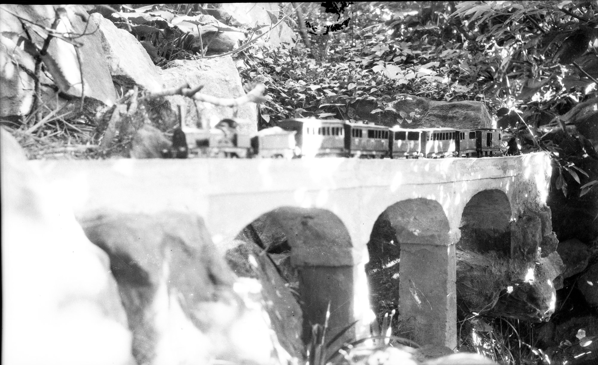 Model locomotive and passenger carriages, on model viaduct in garden setting, unknown date and location., [ARHSBox114_2829]. Living Histories, accessed 14/04/2026, https://livinghistories.newcastle.edu.au/nodes/view/87941