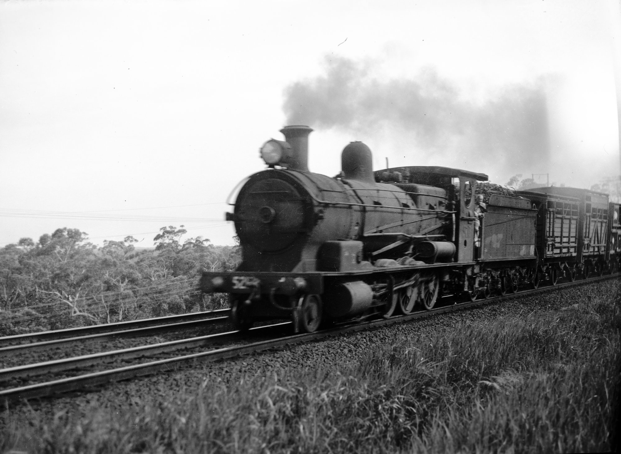 NSWGR D50 class locomotive and freight train, unidentified location, [n.d.], [ARHSBox117_2980]. Living Histories, accessed 09/03/2026, https://livinghistories.newcastle.edu.au/nodes/view/88093