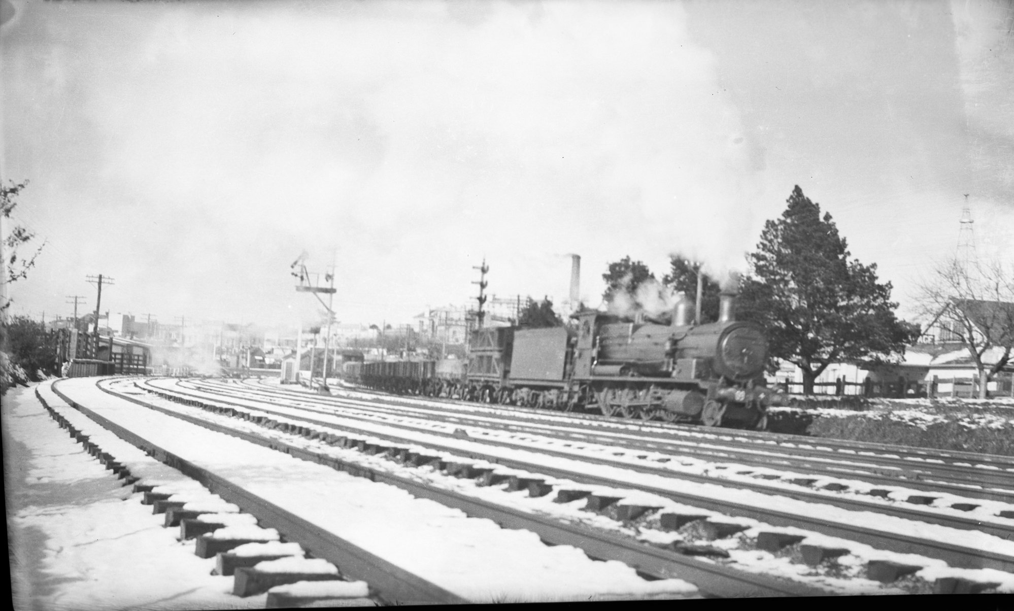 NSWGR D53 Class, no. 5309 or 5409, hauling freight through suburbs after snowfall, unidentified location, [ARHSBox118_3030]. Living Histories, accessed 04/04/2026, https://livinghistories.newcastle.edu.au/nodes/view/88144
