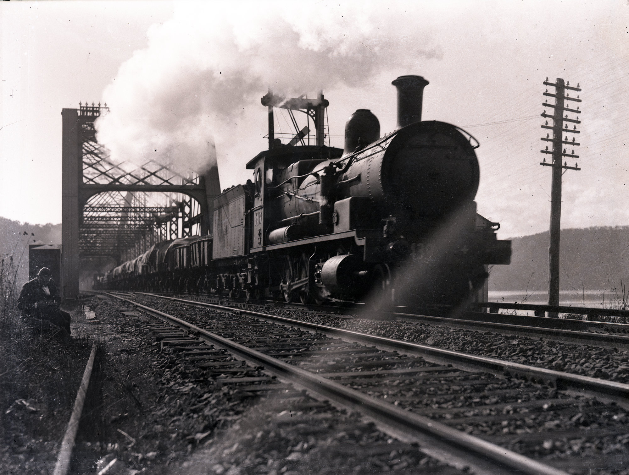 NSWGR D53 Class, no. 5439, leaving old Hawkesbury River Bridge with freight train, Long Island, NSW [1924-1946], [ARHSBox119_3040]. Living Histories, accessed 04/04/2026, https://livinghistories.newcastle.edu.au/nodes/view/88154