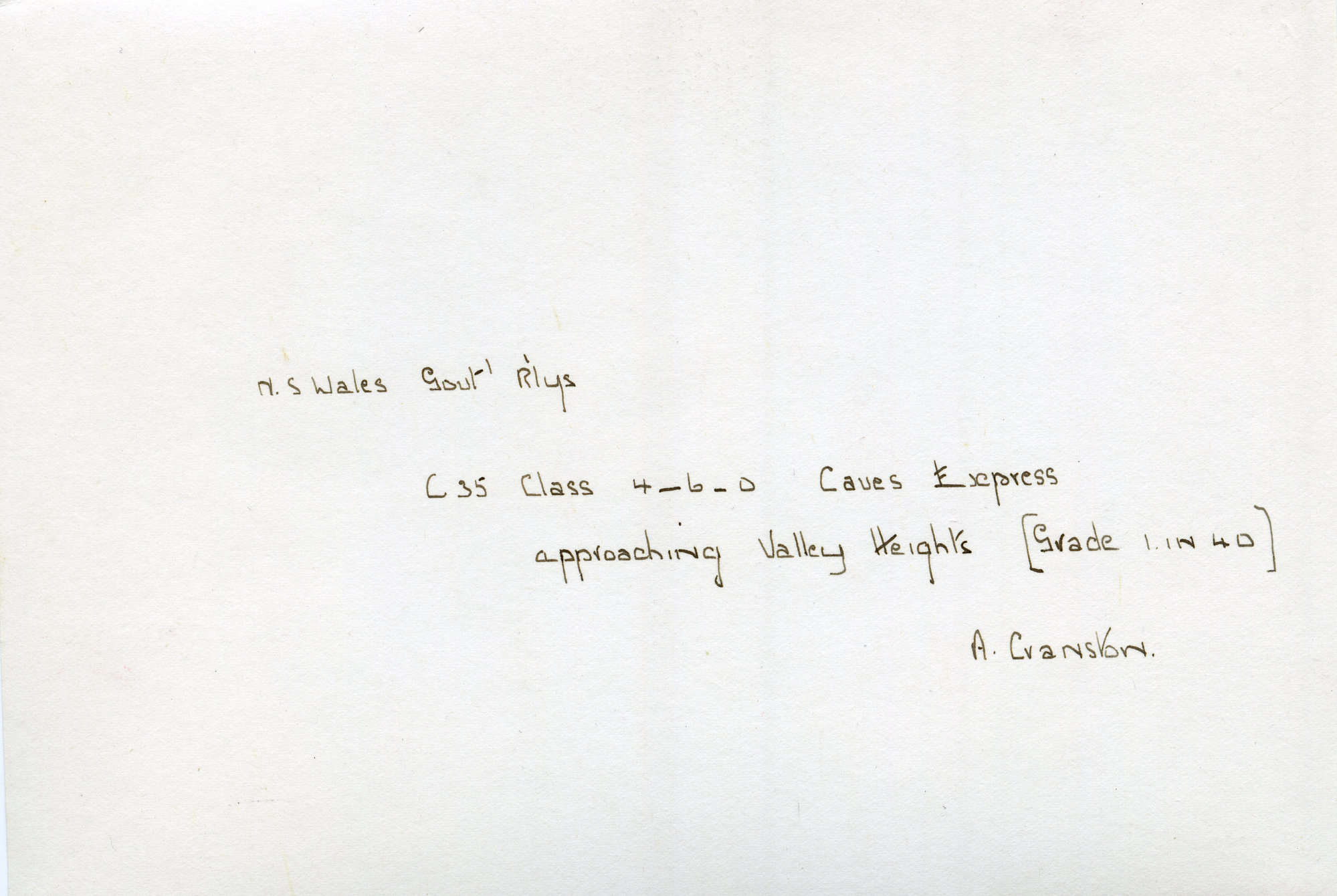 NSWGR C35 class, no. 3530 , approaching Valley Heights with the Caves Express, verso of ARHSBox131_3296, [ARHSBox131_3297]. Living Histories, accessed 24/01/2026, https://livinghistories.newcastle.edu.au/nodes/view/88413