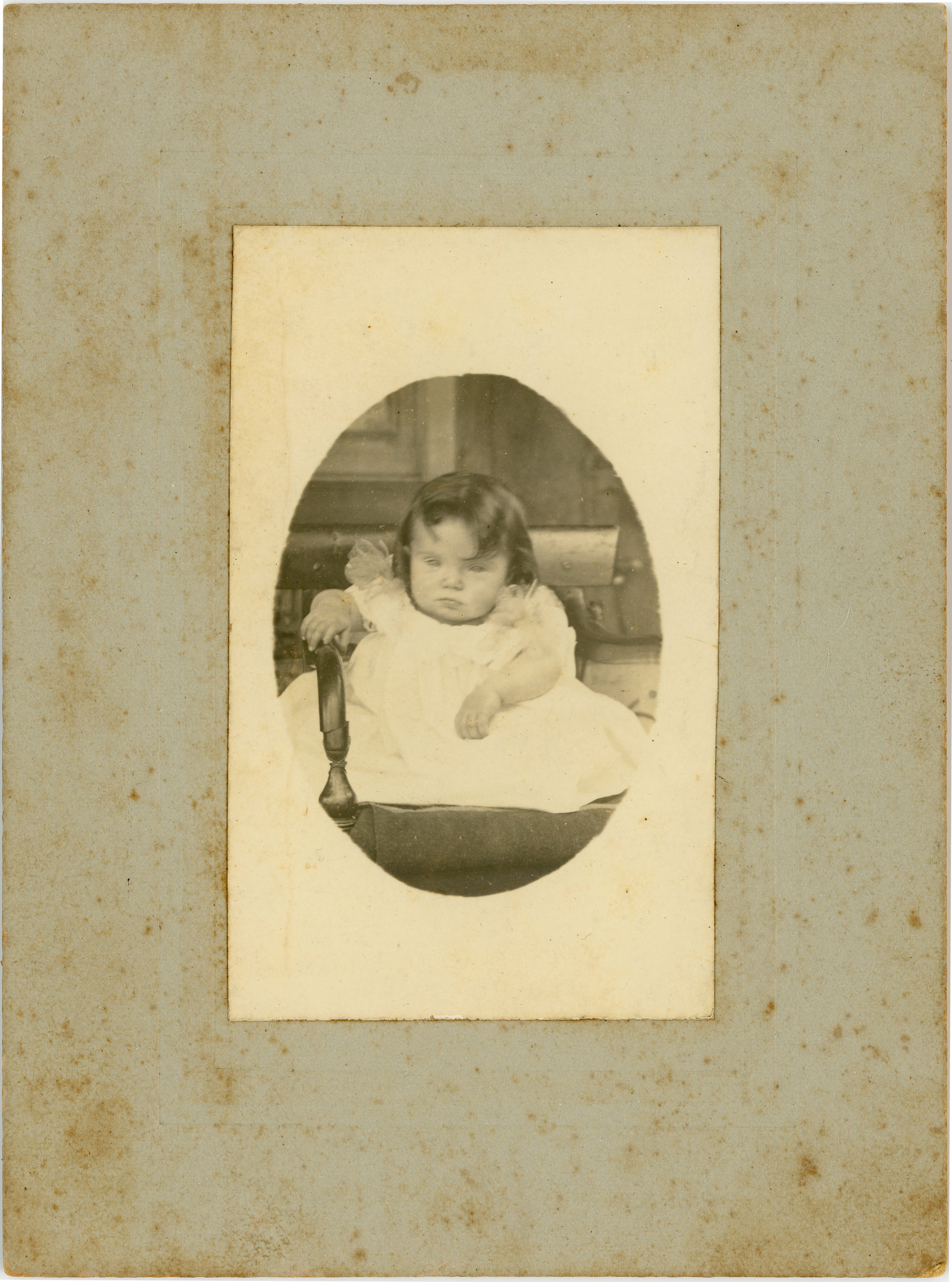A toddler girl sitting in a chair and wears a light coloured dress, [n.d.]