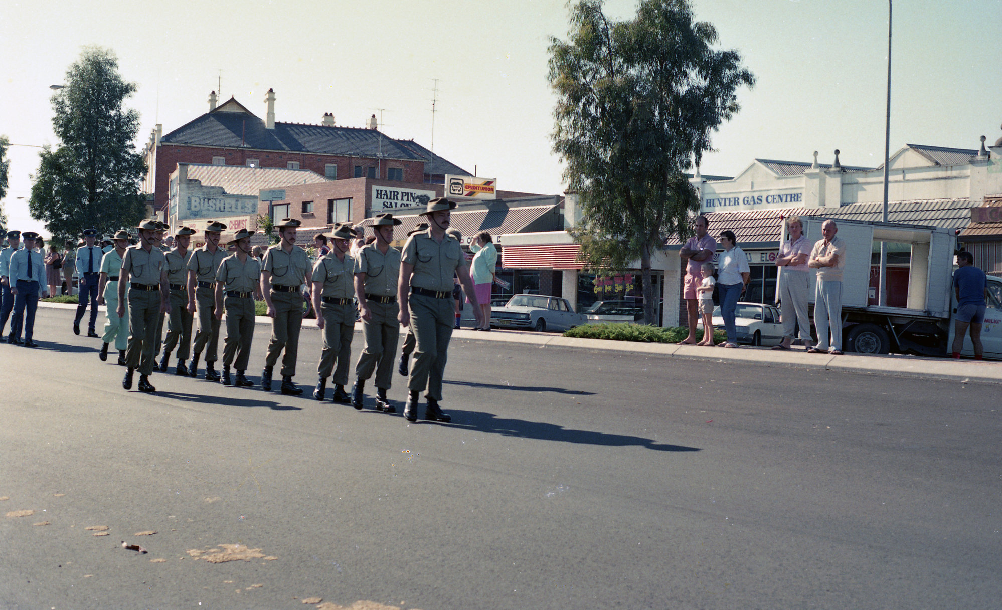 Sternbeck, Percival William, 1921-2004, Soldiers in ANZAC Day march, Kurri Kurri, NSW, 25 April 1988 (25th April 1988), [Sternbeck_Bk17_Apr_1988_005]. Living Histories, accessed 18/03/2026, https://livinghistories.newcastle.edu.au/nodes/view/89259