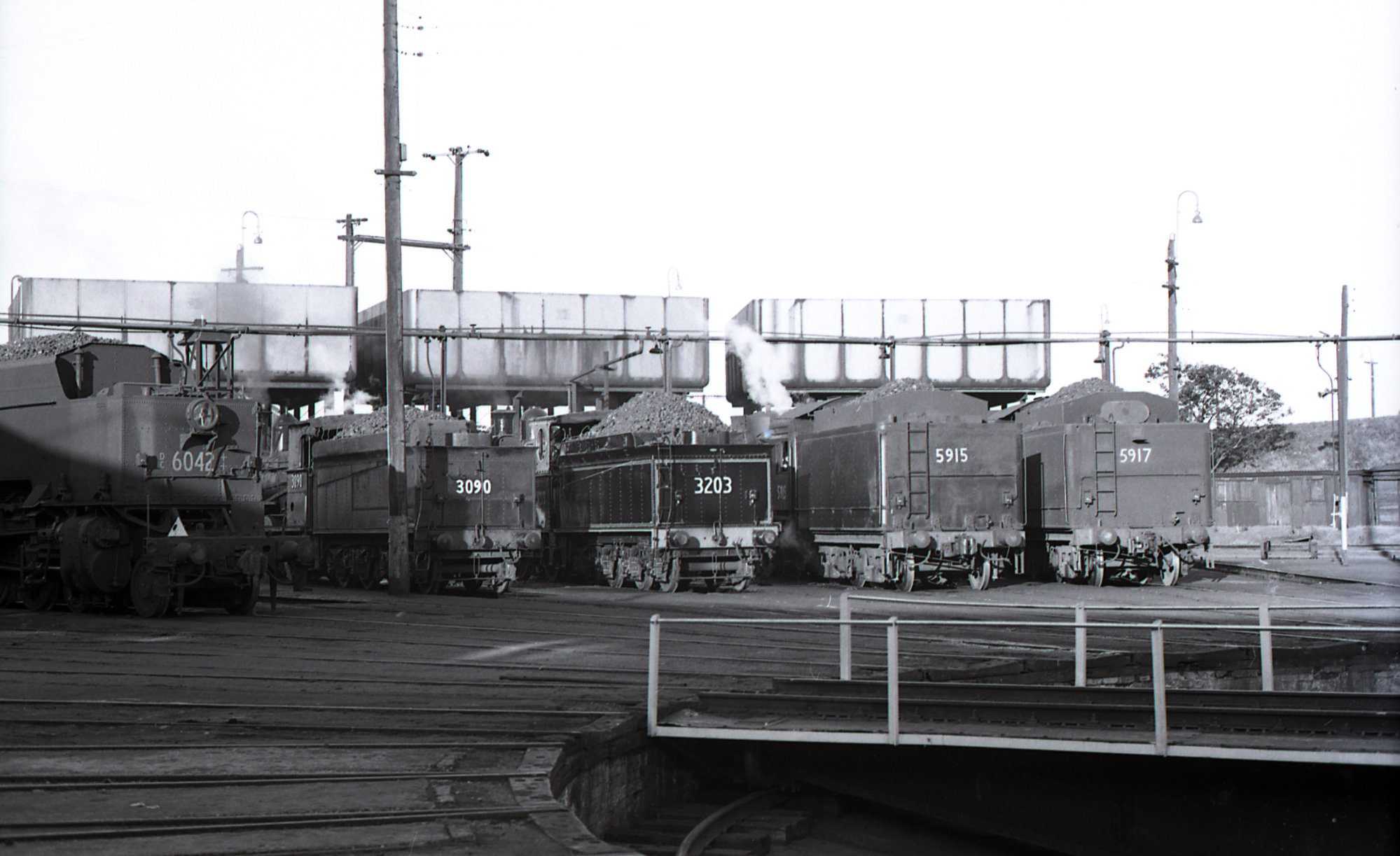 Locomotives 6042, 3090, 3203, 5915 and 5917, Broadmeadow Locomotive Depot, 13 August 1972