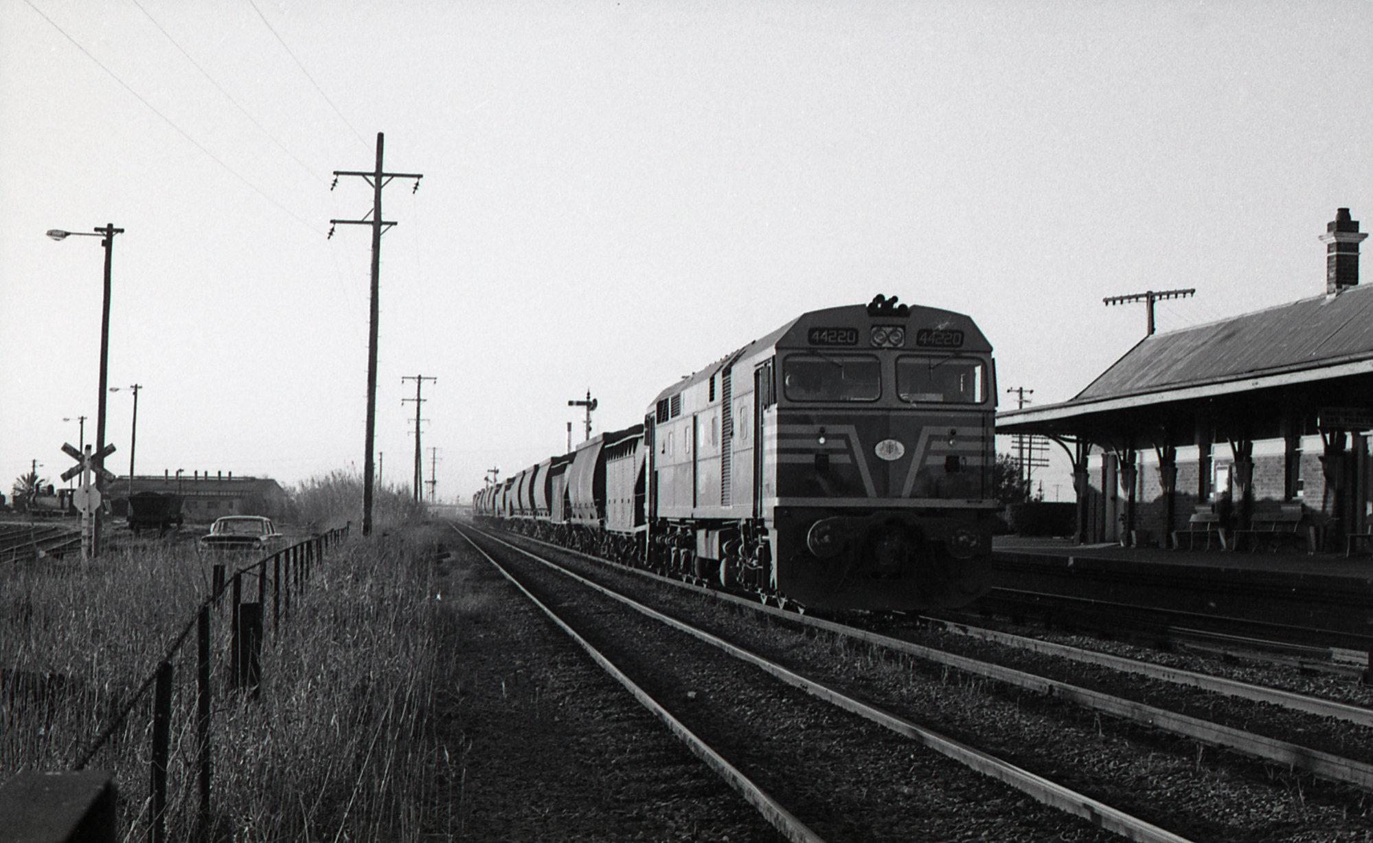 Double headed 44220 class on 'Up Newdell Coal train' passing Hexham Station, NSW, 24 August 1972
