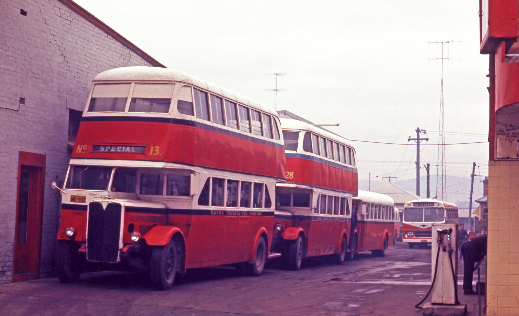 Rover Motors Bus Co AEC Regent MO-902 (x DRT&T 1403), MO-3576 (x 1541), depot yard, Vincent Street, Cessnock, NSW, 25 May 1970