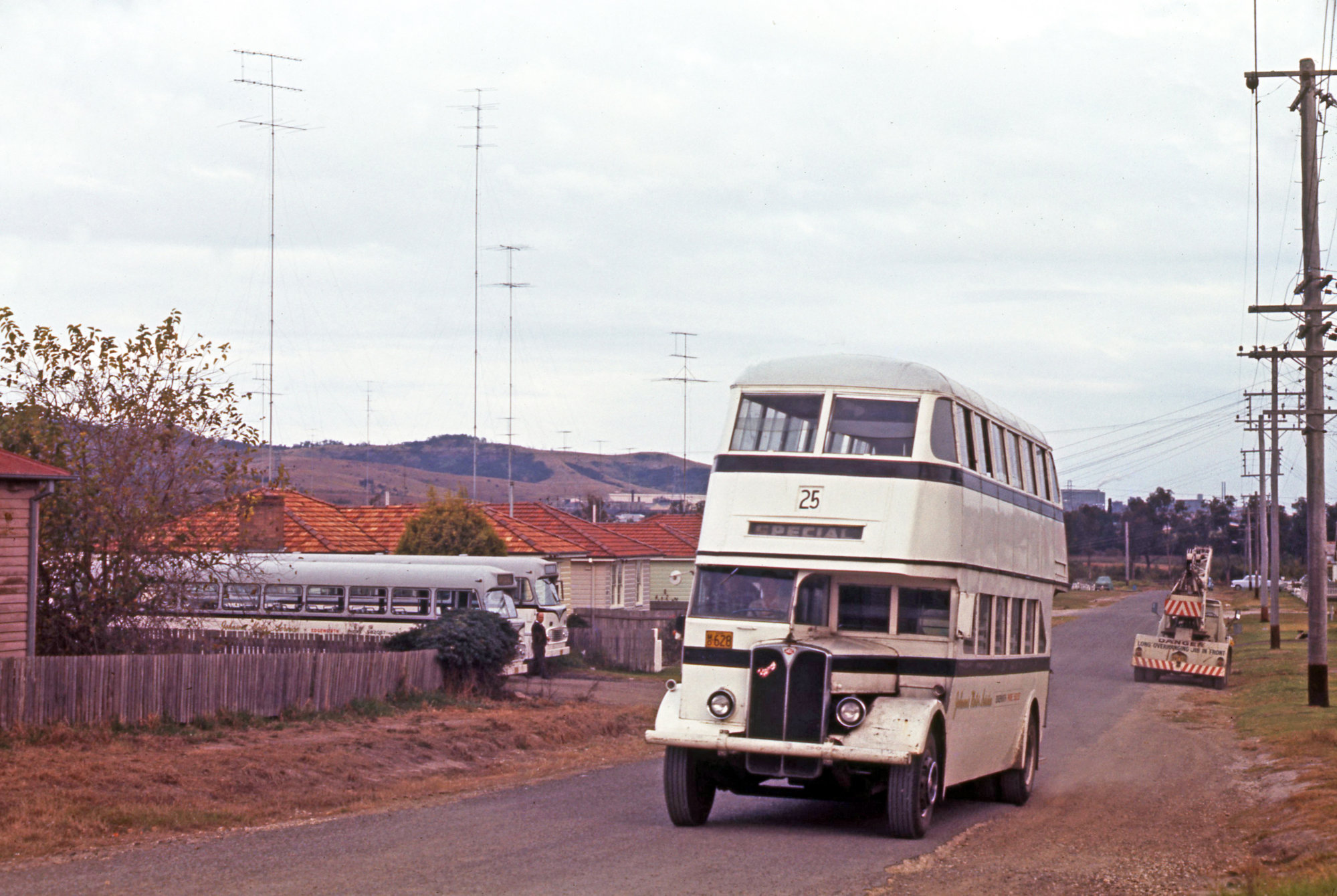 Ward, John, Johnson's Bus Service AEC Regal DD 628 privately built outside depot side street, off Main Road, Edgeworth, NSW, 25 May 1970 (25th May 1970), [01462_250570]. Living Histories, accessed 16/04/2026, https://livinghistories.newcastle.edu.au/nodes/view/90387