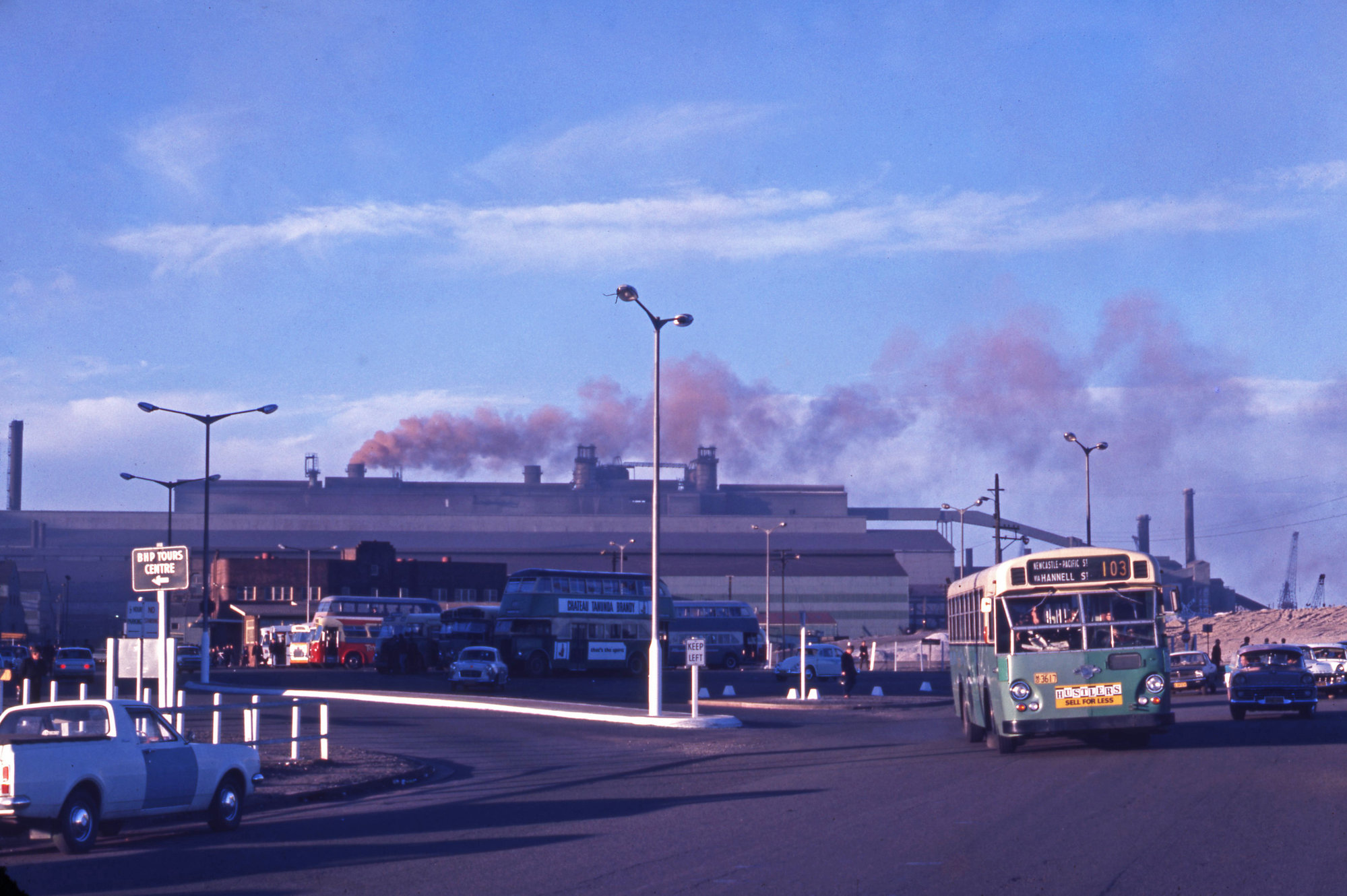 Ward, John, DGT Leyland Leopard MK I 3617 & others leaving BHP Steelworks, Selwyn Street, Port Waratah, Newcastle, NSW, 29 May 1971 (29th May 1971), [02441_290571]. Living Histories, accessed 19/03/2026, https://livinghistories.newcastle.edu.au/nodes/view/90506