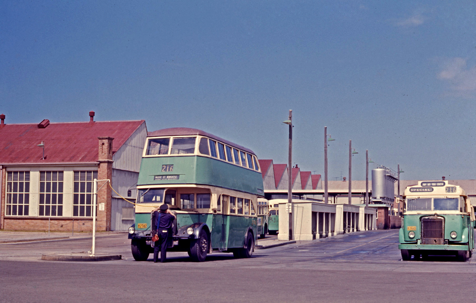 Ward, John, DGT Leyland OPD2-1 2742 Leyland OPS2-1 2660, depot yard, Denison Street, Hamilton, NSW, 18 September 1971 (18th September 1971), [02882_180971]. Living Histories, accessed 17/01/2026, https://livinghistories.newcastle.edu.au/nodes/view/90561