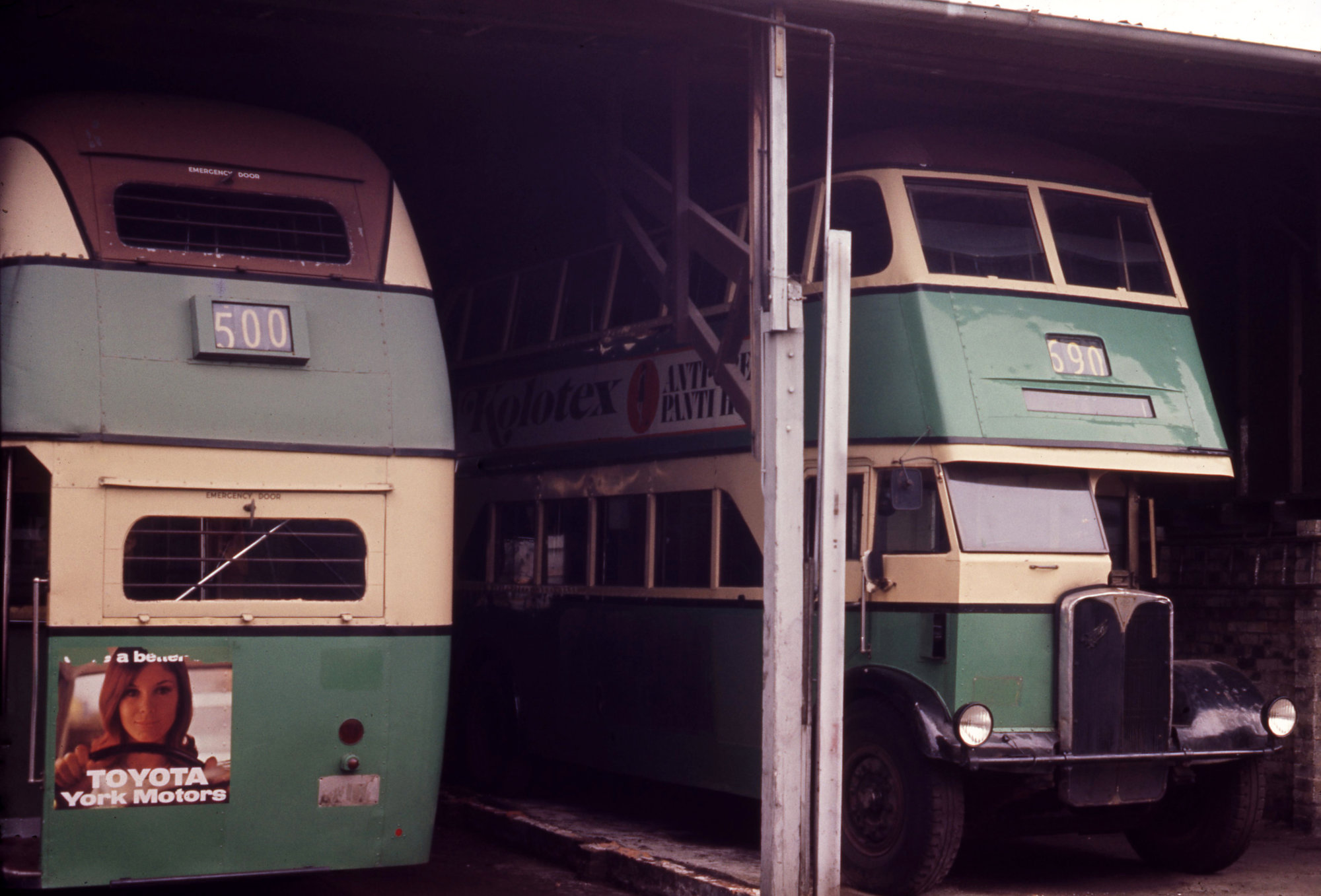 Rover Motors unreg AEC Regent IIIs (x DRT&T 2176), unreg (x DRT&T 2201), depot shed, Vincent Street, Cessnock, NSW, 20 November 1971