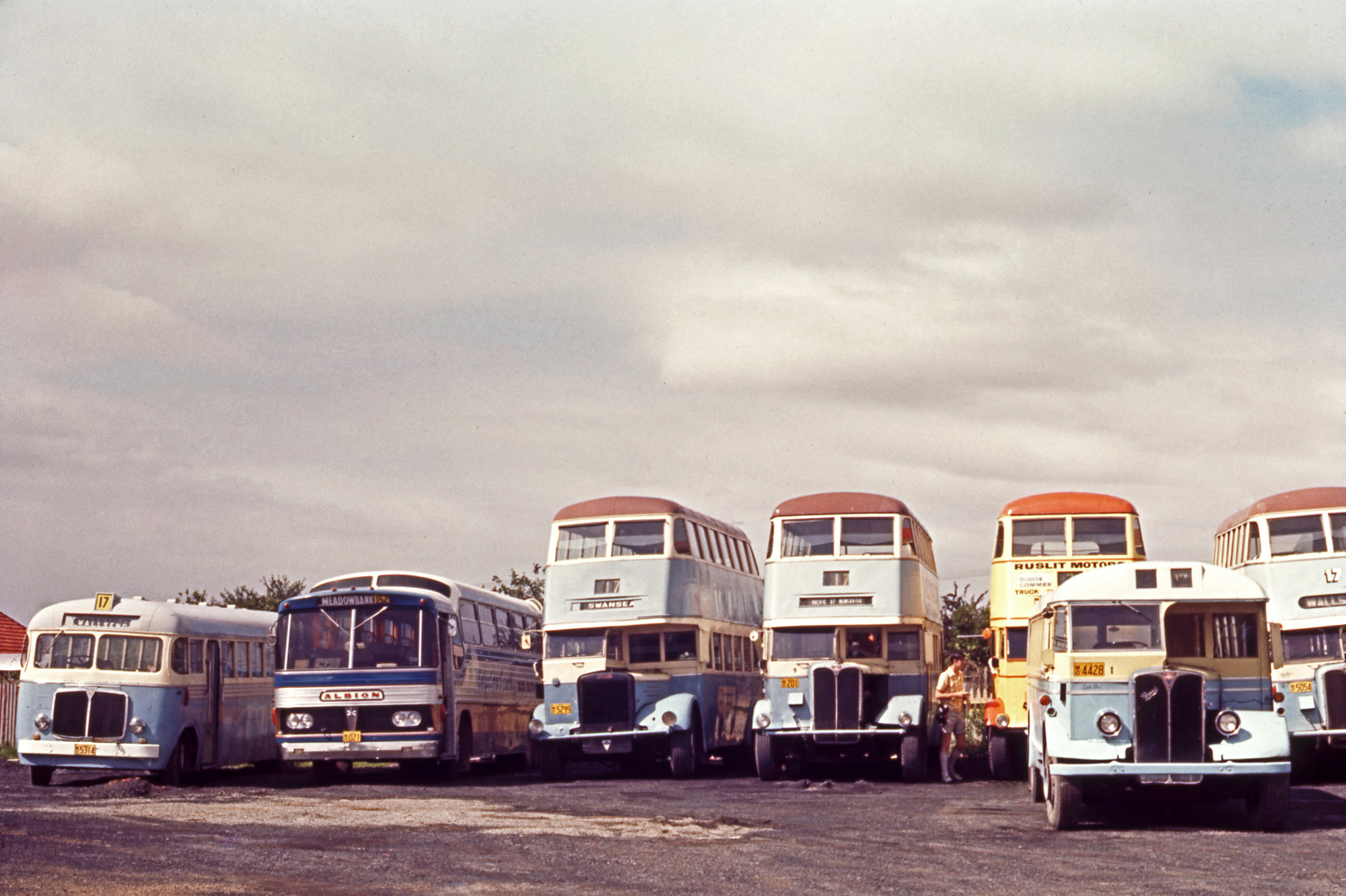 Linsley's AEC Regent SD 5314 (x DD 1543), Ley OPD1-1 5299 (x 1810), Meadowbank Albion VK43L 021 HCVA others depot, Wallsend, NSW, 5 December 1971