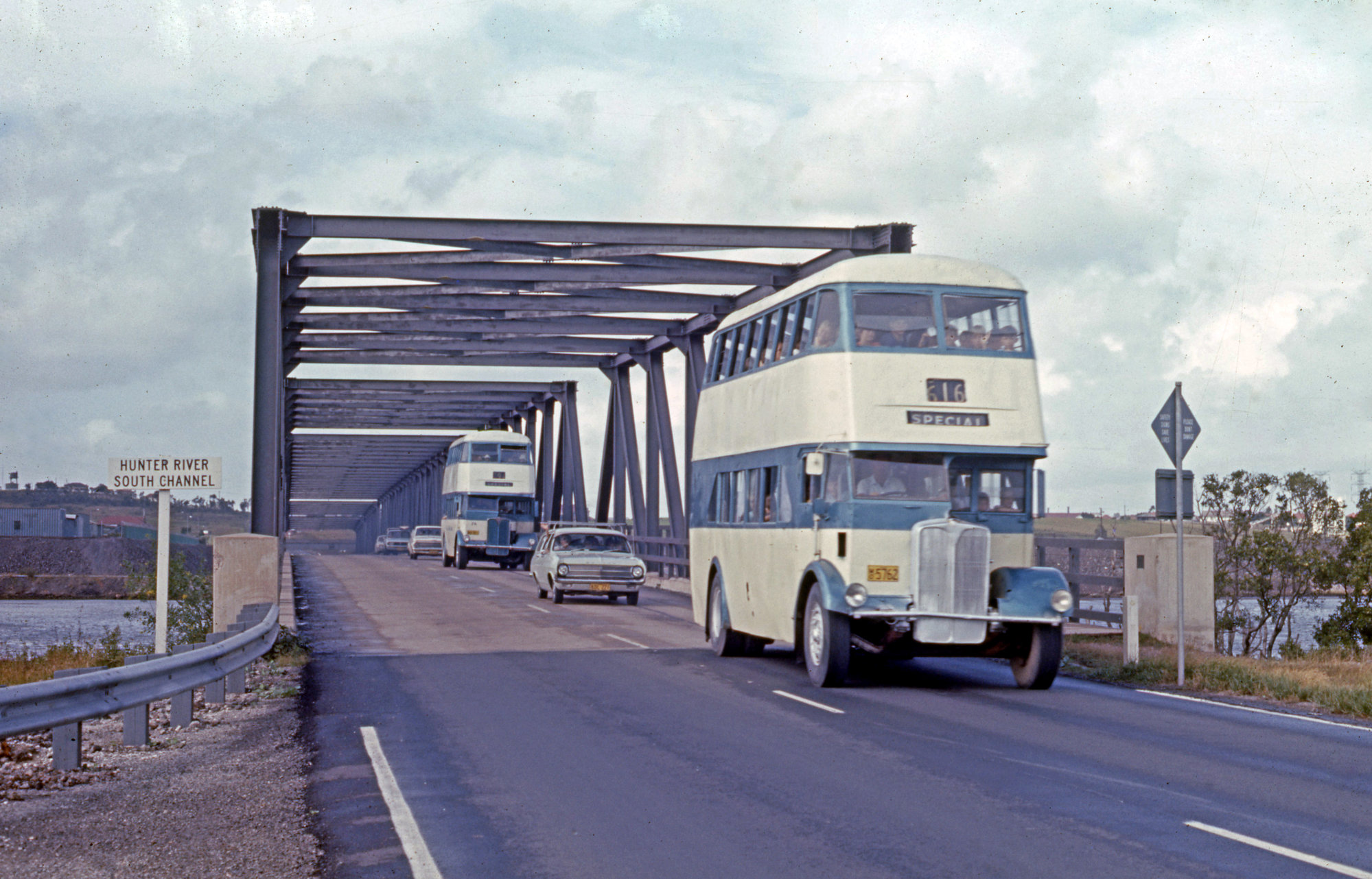 Ward, John, Raymond Terrace Bus AEC Regent IIIs 5762 (x 2415), MO-001 (x 2283), South Arm Hunter River towards Kooragang Island, Newcastle, NSW, 4 March 1972 (4th March 1972), [03903_040372]. Living Histories, accessed 16/04/2026, https://livinghistories.newcastle.edu.au/nodes/view/90706
