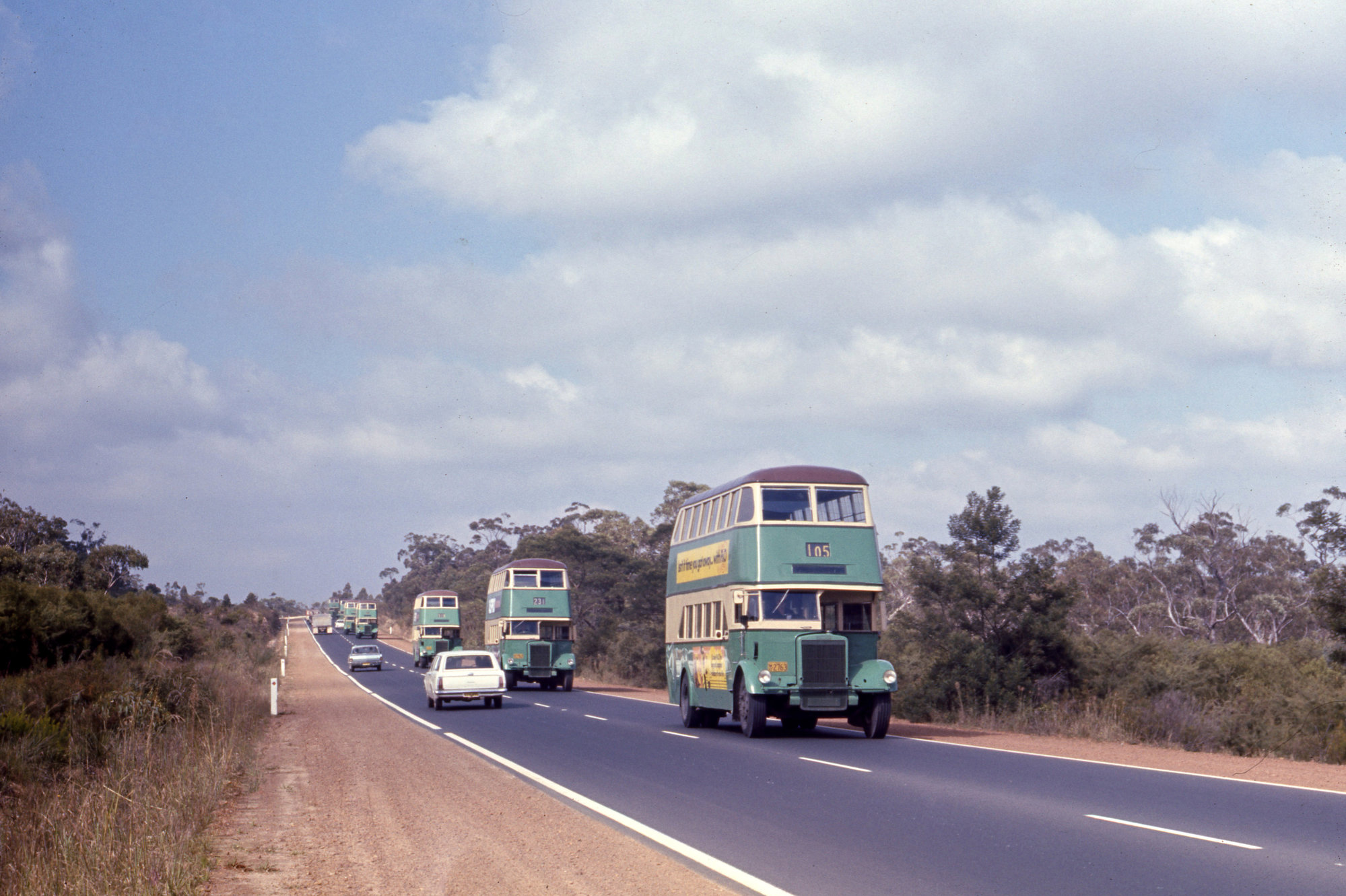 DGT Leyland OPD2-1s 2763 2722 2677 2690 2750, Peats Ridge Road, approaching Peats Ridge, NSW, 28 March 1972