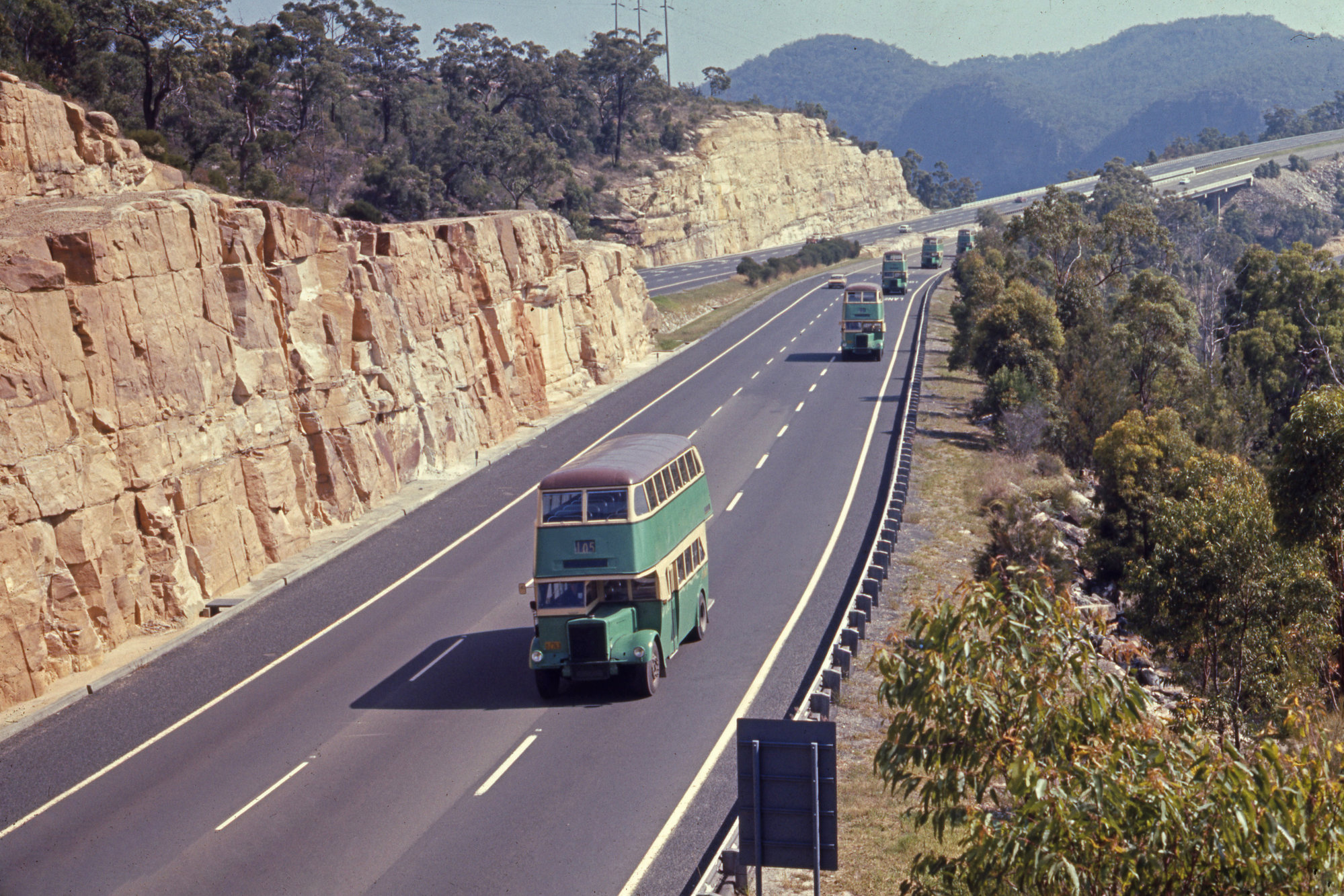 DGT Leyland OPD2-1s 2763 2762 2722 2677 2690, Mt White to Hawkesbury River section of F3 Highway, NSW, 28 March 1972