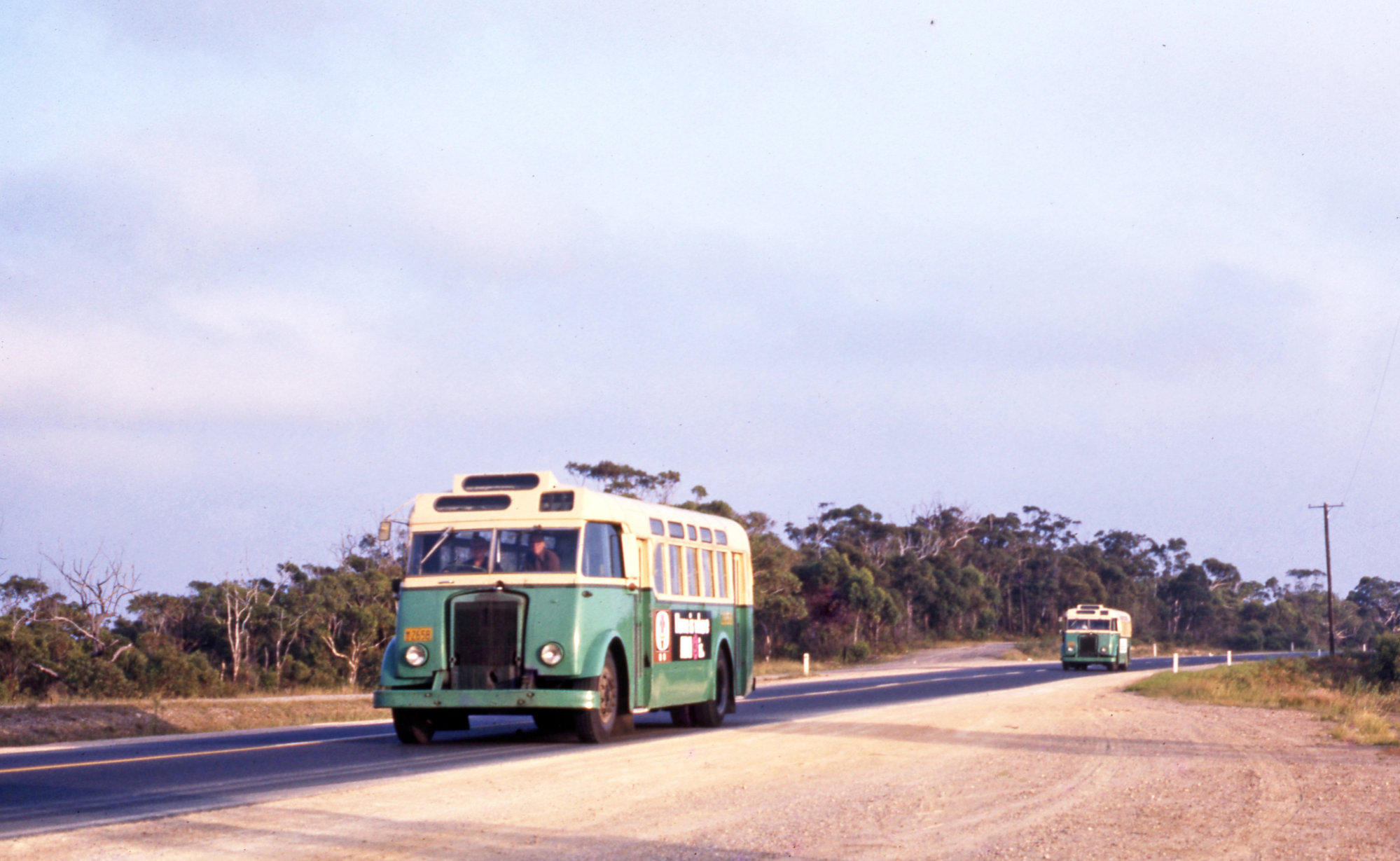 PTC Leyland OPS2-1s 2658, 2609, Pacific Highway, between Swansea & Doyalson, NSW, 22 January 1974