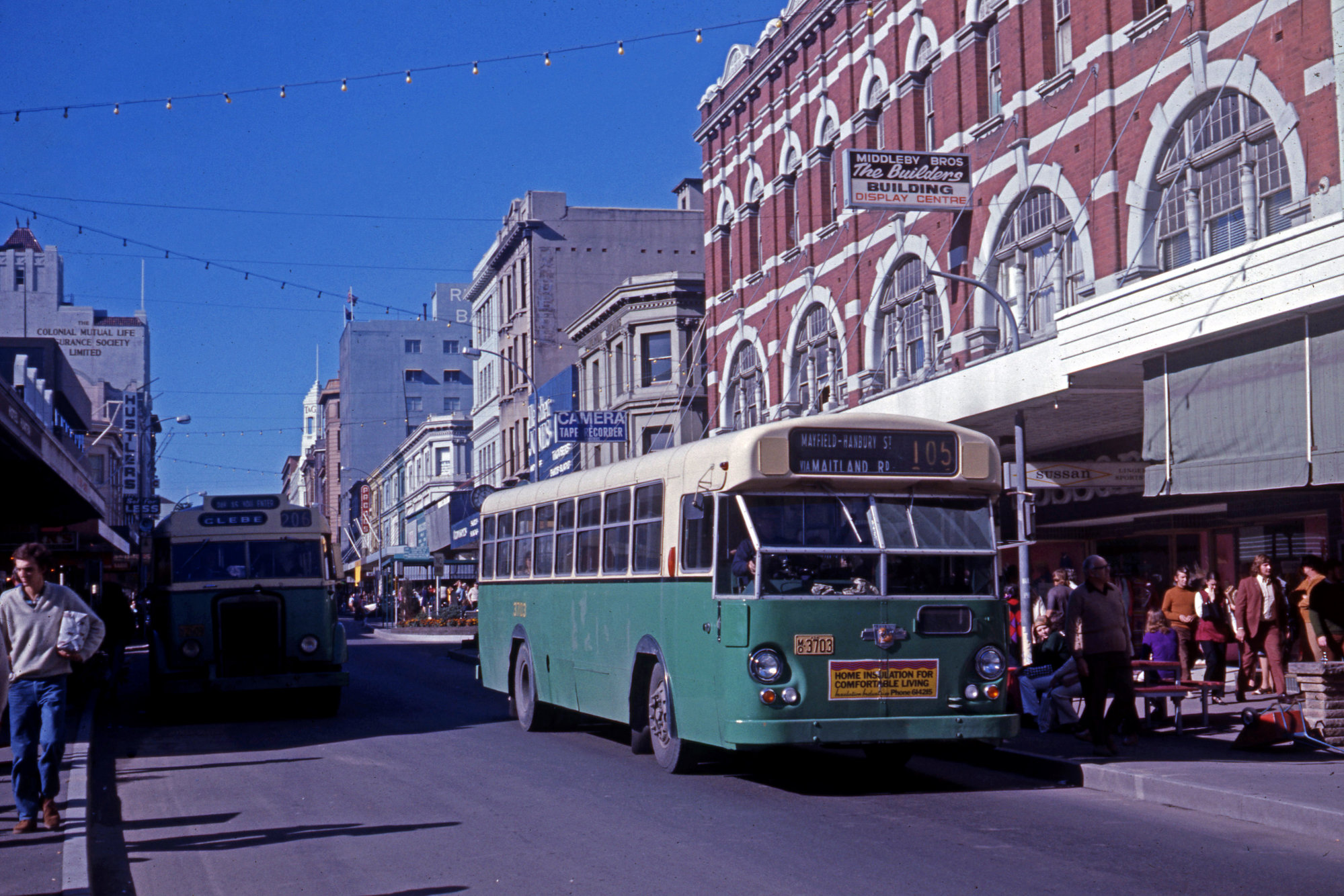 Ward, John, DGT Leyland Leopard MK I 3703, Leyland OPS2-1 2609, Hunter Street near Perkins Street, Newcastle, NSW, 10 June 1972 (10th June 1972), [04422_100672]. Living Histories, accessed 24/01/2026, https://livinghistories.newcastle.edu.au/nodes/view/91145