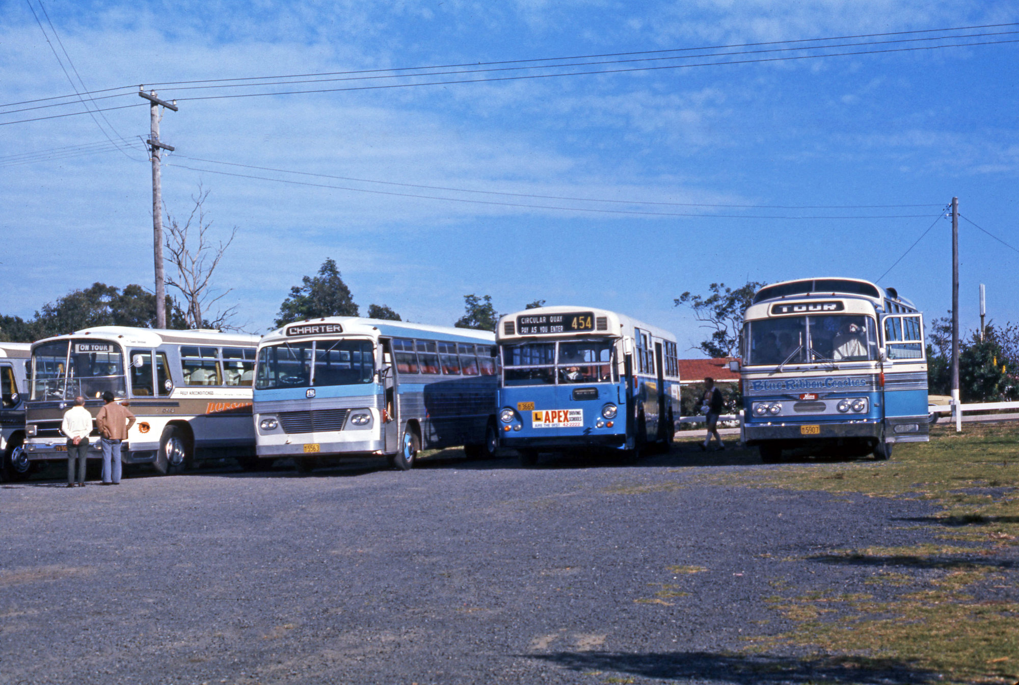 Ward, John, Personality Tours Mercedes TV-592, Unknown Bedford Coach 5563, PTC Leyland Leopard 3665 (HCVA Tour), Blue Ribbon Coaches Hino 5907, Oak Dairy Restaurant, Peat's Ridge, NSW, 24 May 1975 (24th May 1975), [06550_240575]. Living Histories, accessed 06/03/2026, https://livinghistories.newcastle.edu.au/nodes/view/91341