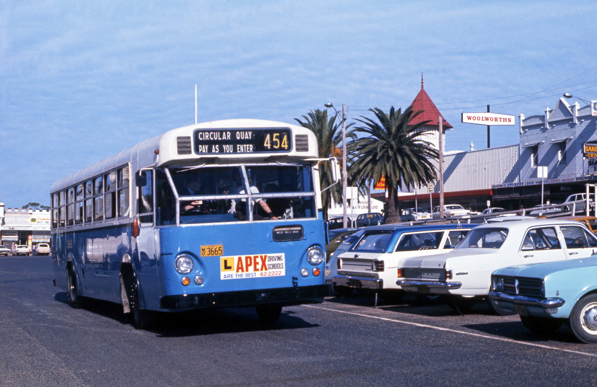 PTC Leyland Leopard MK I 3665 (HCVA Tour), parking area alongside railway station and Pacific Highway, Wyong, NSW, 24 May 1975