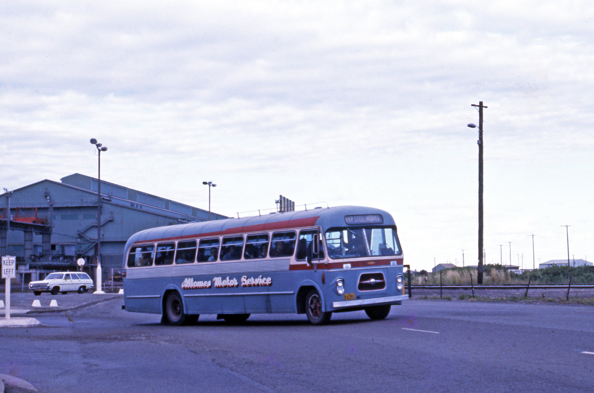 Allomes' Garden Suburb White WB20 4391 leaving BHP Steelworks off Selwyn Street, Mayfield, NSW, 18 October 1975