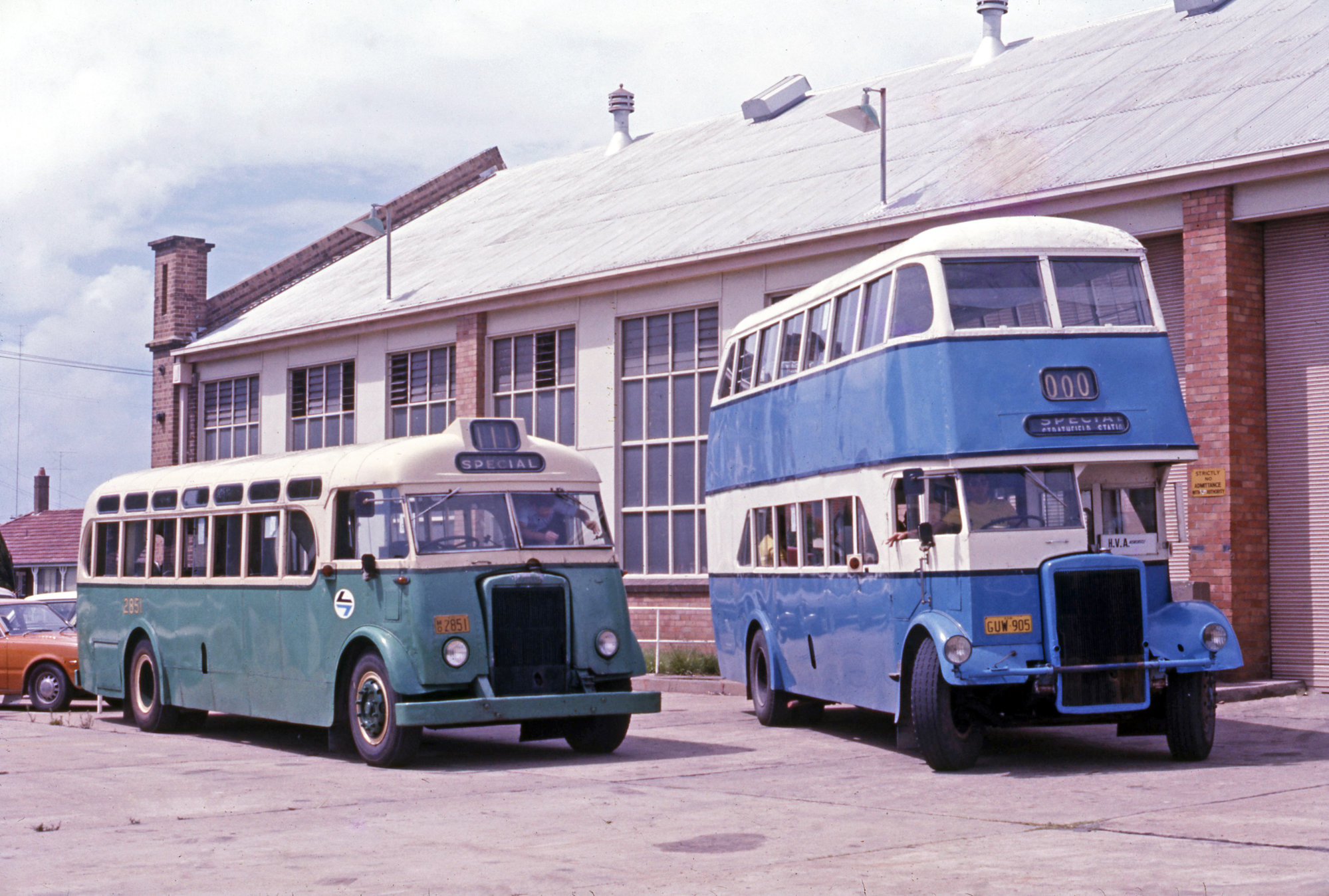 PTC Leyland OPD2-1 SD 2851, HCVA Tour, HVTM Leyland OPD2-1 GUW-905 (x DGT 2769), Denison Street, Hamilton Bus Workshops, NSW, 21 February 1976