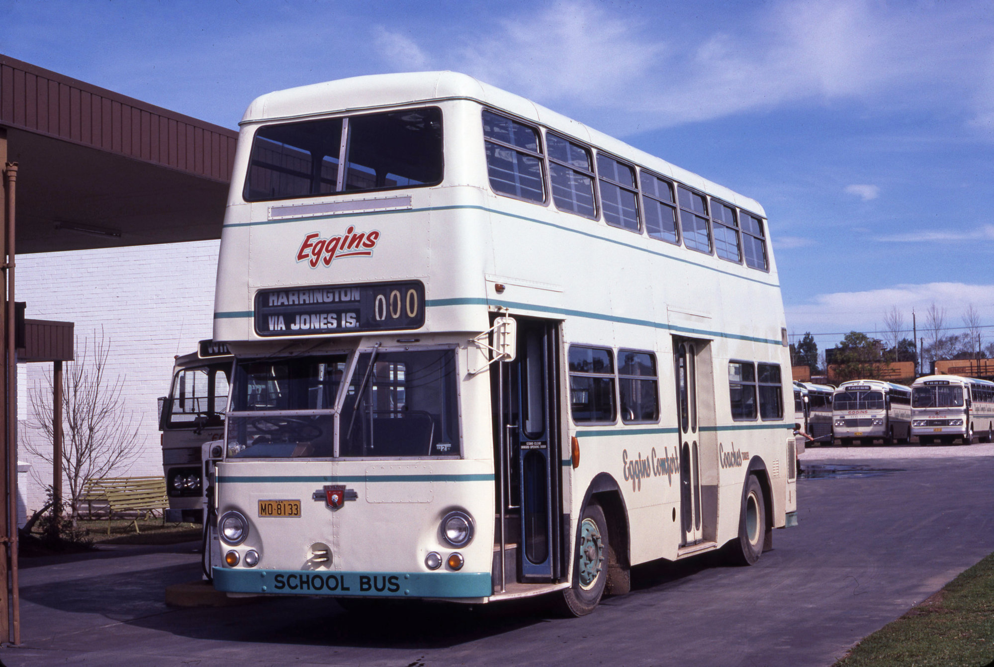Eggins Taree Leyland Atlantean MO-8133 (x 1138) & others buses, depot yard, Taree, NSW, August 1980
