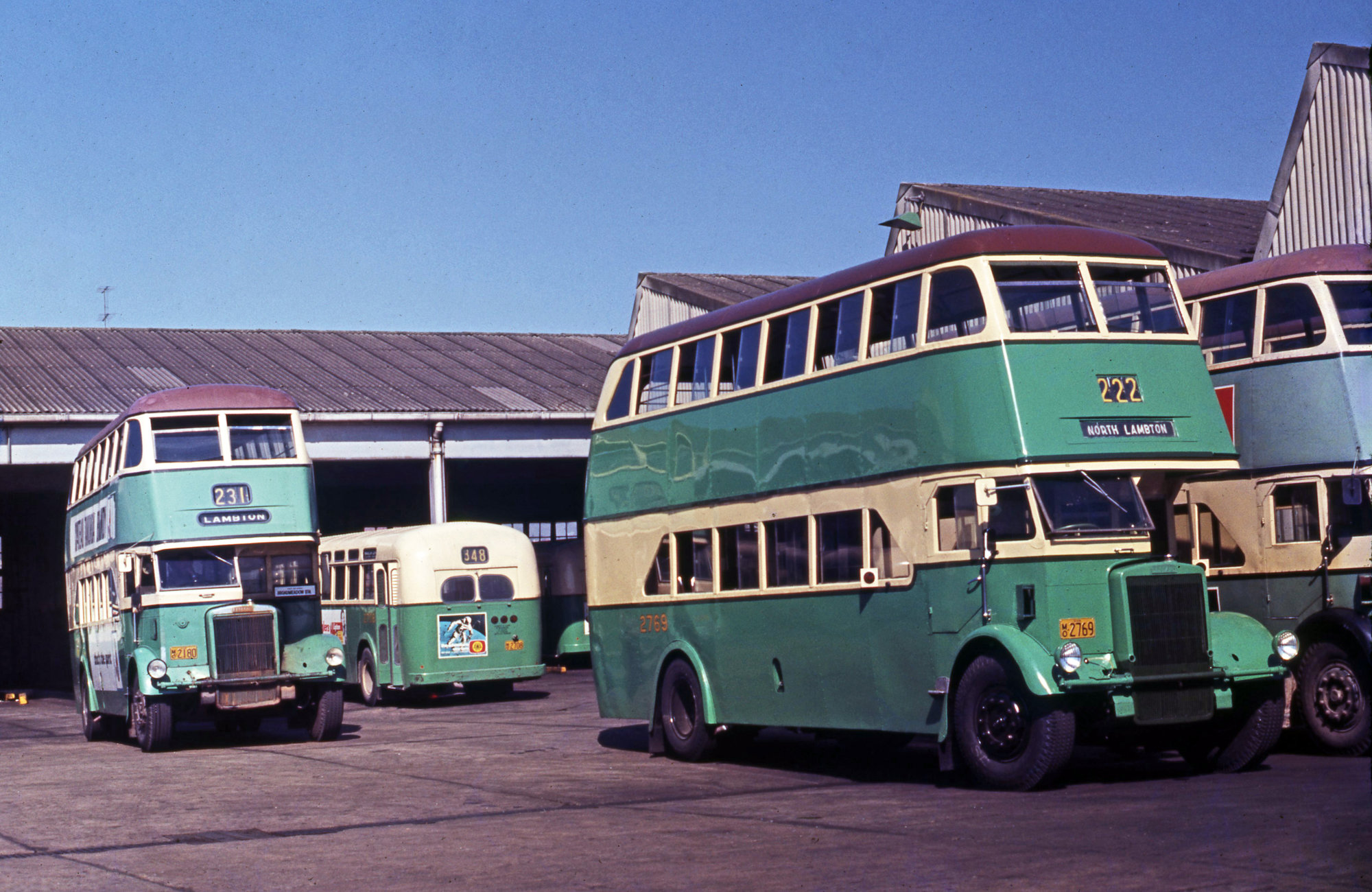 Travers, Greg, DGT Leyland OPD2-1s 2769 2180 2721 2723 OPSU1-1 2708, depot yard, Denison Street, Hamilton, NSW, 9 April 1971 (9th April 1971), [08867_090471]. Living Histories, accessed 15/03/2026, https://livinghistories.newcastle.edu.au/nodes/view/91695