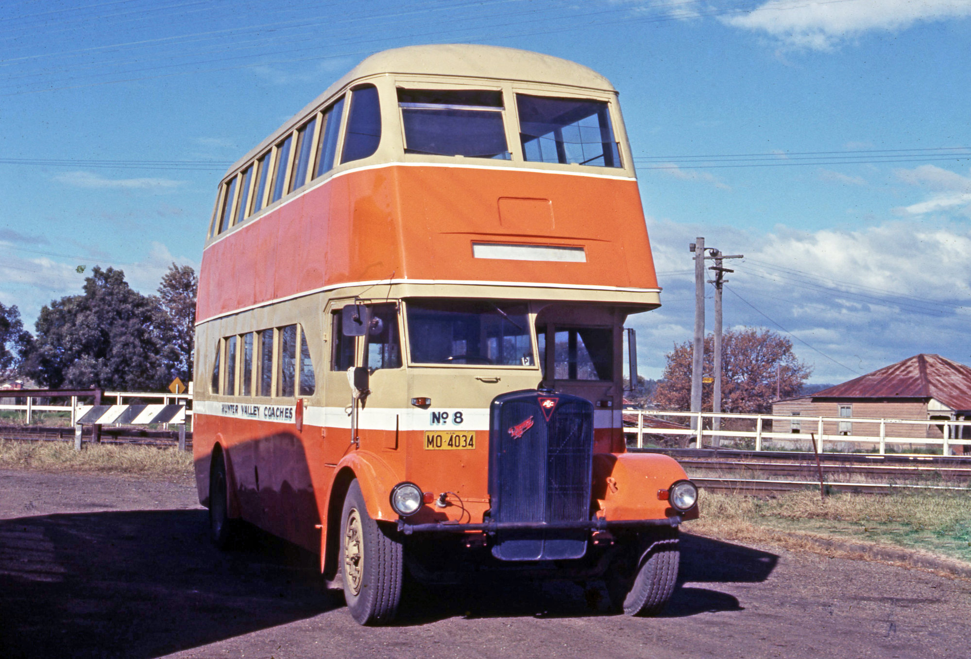 Hunter Valley AEC Regent III MO-4034 (xDRT&T 2174), near depot, side street, Maitland, NSW, 1970