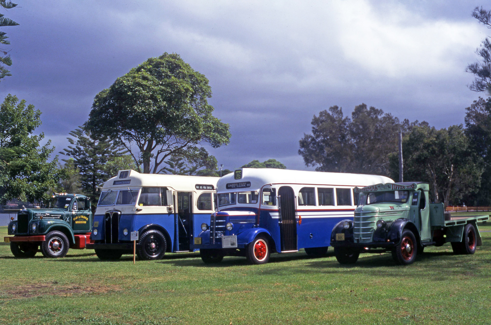 Ward, John, HCVA B61 Mack 061, Chris O'Brien AEC Regent III SD 2878, Jon Graham Bedford OB 100, R Thomas International LE 30 005, Speers Point Park, NSW, 29 March 1997 (29th March 1997), [09373_290397]. Living Histories, accessed 21/01/2026, https://livinghistories.newcastle.edu.au/nodes/view/91733