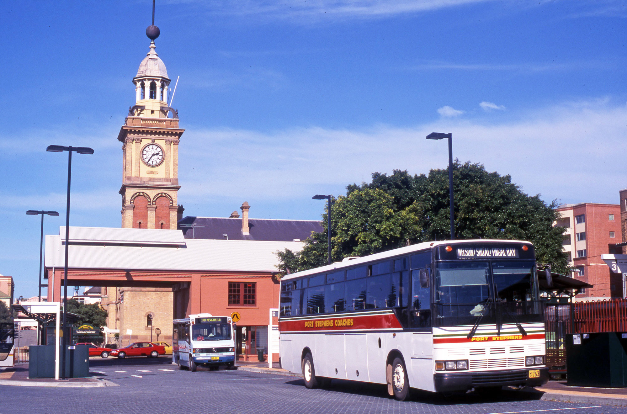 Port Stephens MCA Cummins 763, Blue Ribbon Mercedes 0814 MO-3311, terminus, Newcastle Railway Station, NSW, 4 September 1999