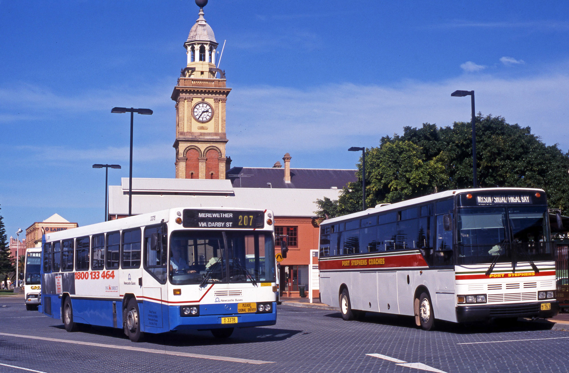 Ward, John, STA Mercedes 0305 MK V 3378, Port Stephens MCA, Cummins 763, Great Lakes Coach MO-4409, terminus, Newcastle Railway Station, NSW, 4 September 1999 (4th September 1999), [09599_040999]. Living Histories, accessed 16/01/2026, https://livinghistories.newcastle.edu.au/nodes/view/91761
