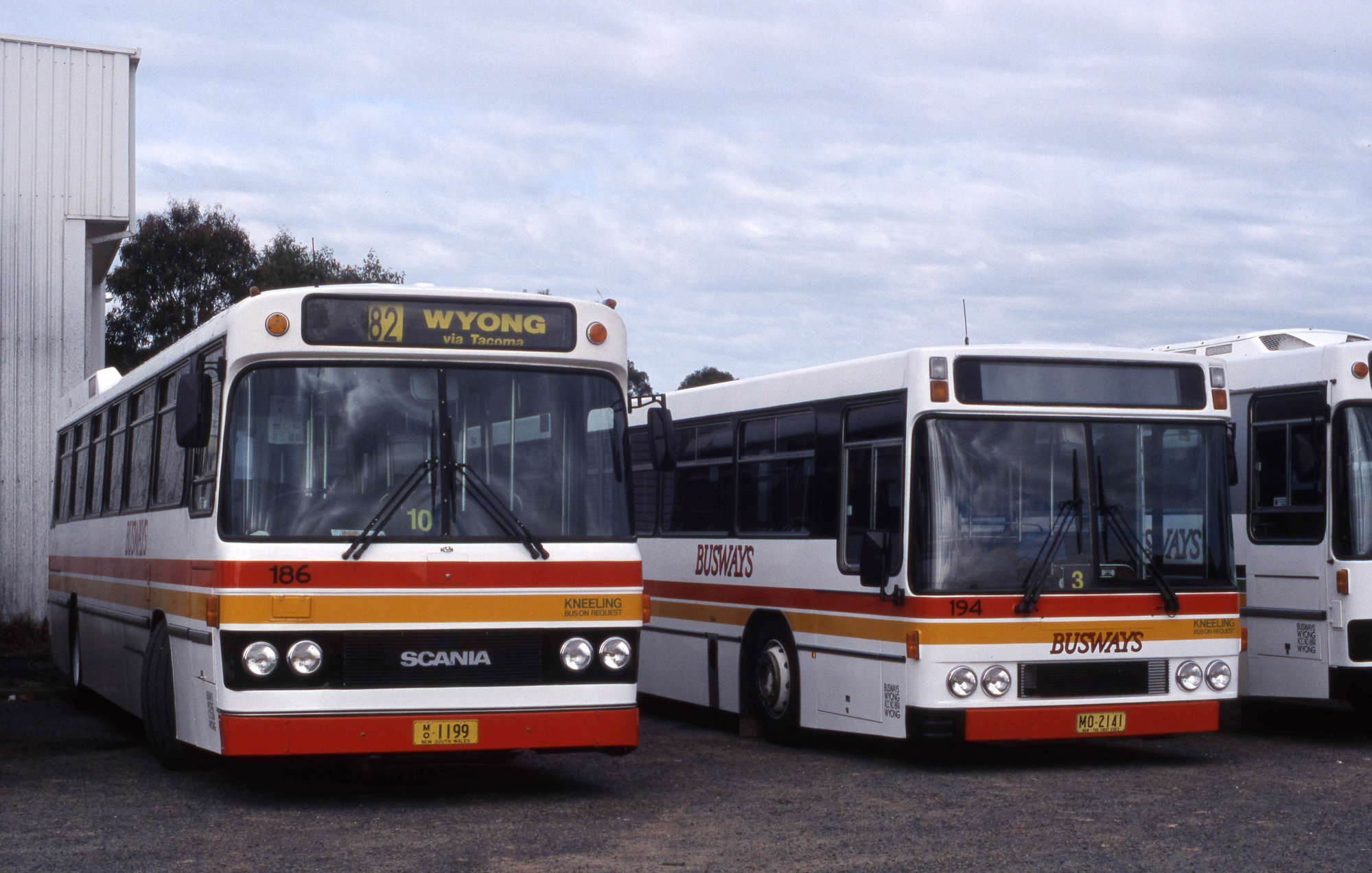 Busways Scania K92 1199 (186), Mercedes O405 MO-2141 (194), depot yard, Charmhaven, NSW, 16 August 2003