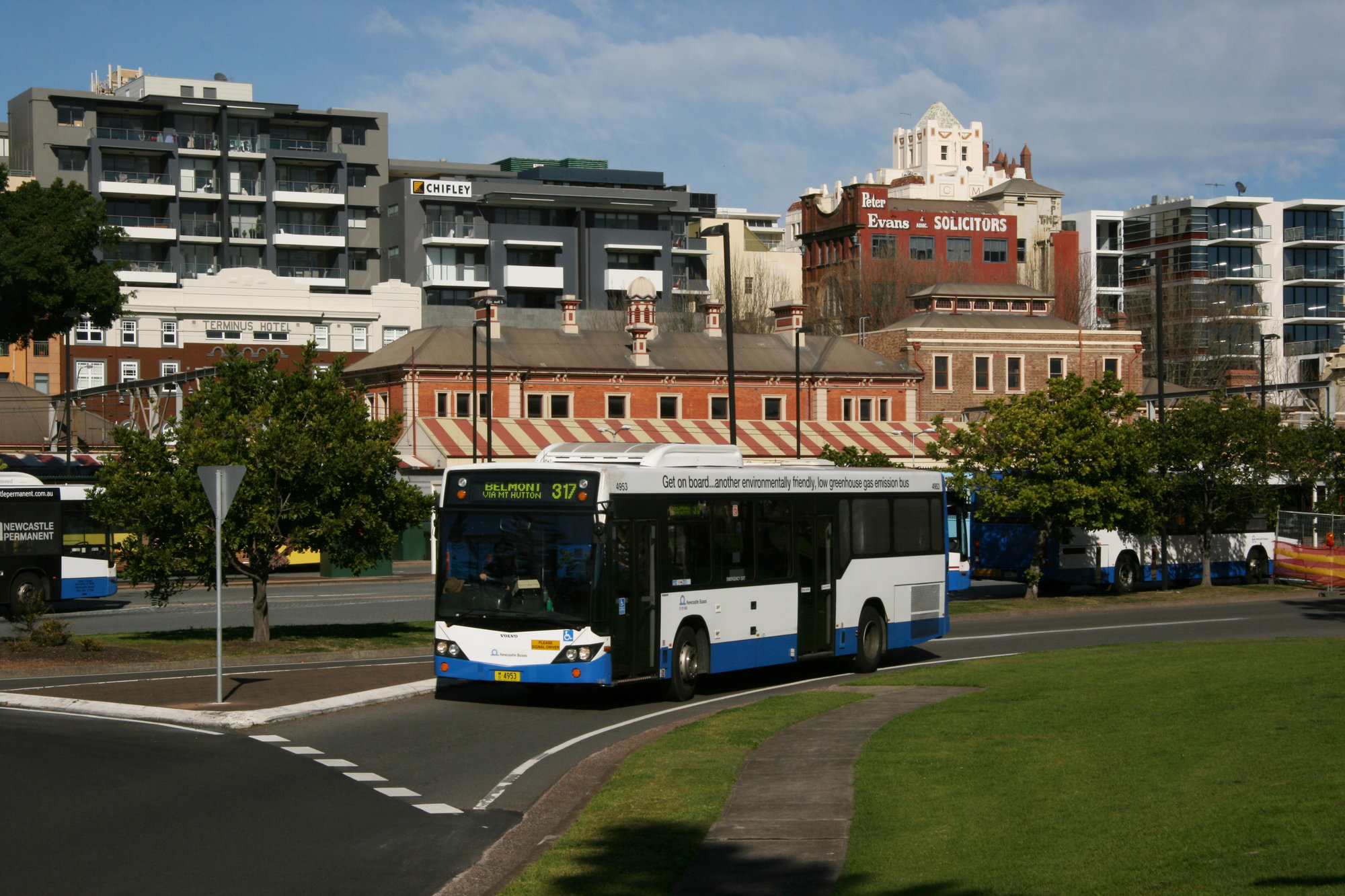 STA Volvo B12BLE 4953 & 4 other buses, Wharf Road at roundabout with Watt Street, Newcastle, NSW, 6 August 2013