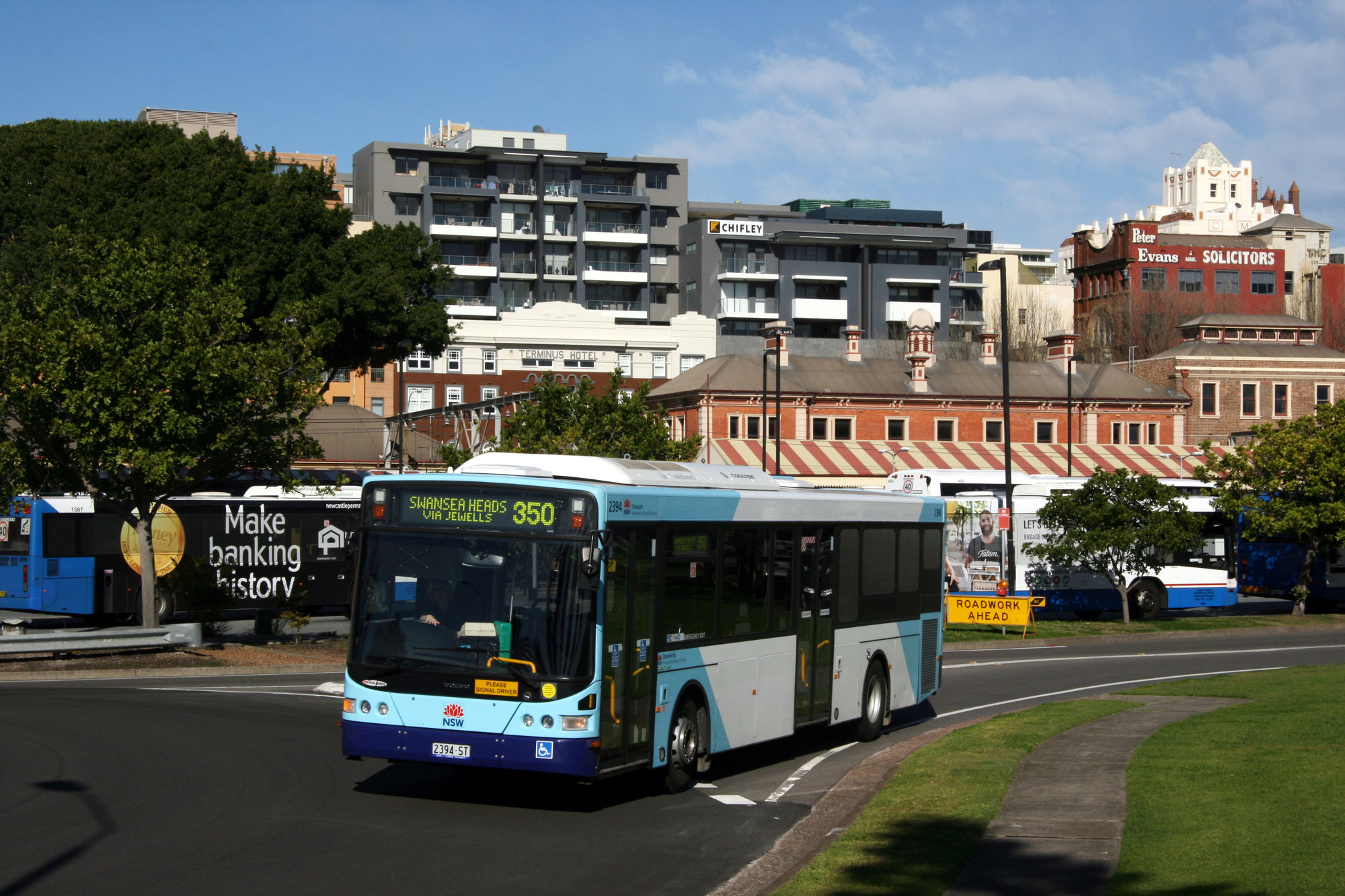 STA Volvo B7RLE 2394 & 3 other buses, Wharf Road at roundabout with Watt Street, Newcastle, NSW, 6 August 2013