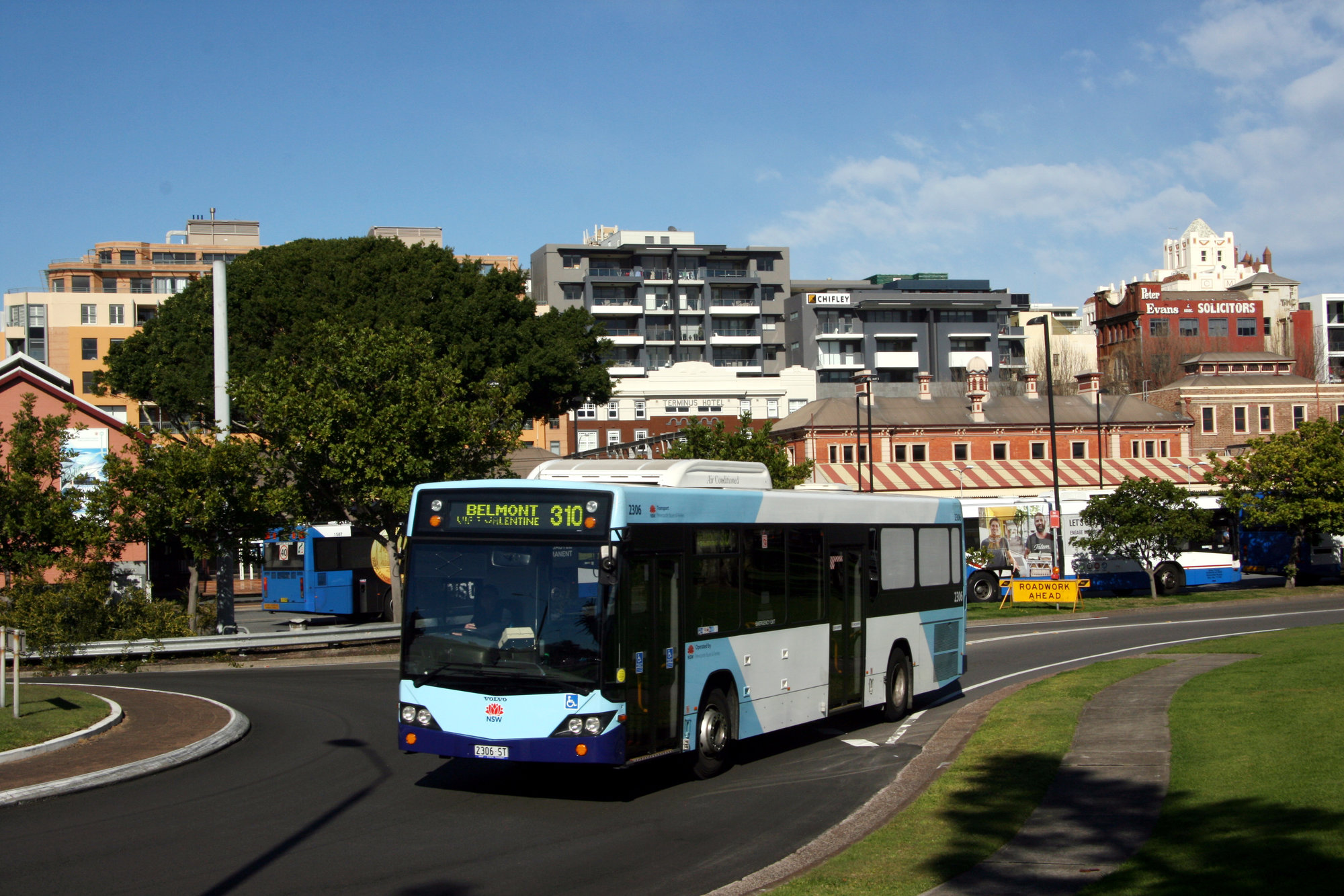 Ward, John, STA Volvo B12BLE 2306 & 2 other buses, Wharf Road at roundabout with Watt Street, Newcastle, NSW, 6 August 2013 (6th August 2013), [36765_060813]. Living Histories, accessed 19/03/2026, https://livinghistories.newcastle.edu.au/nodes/view/91878